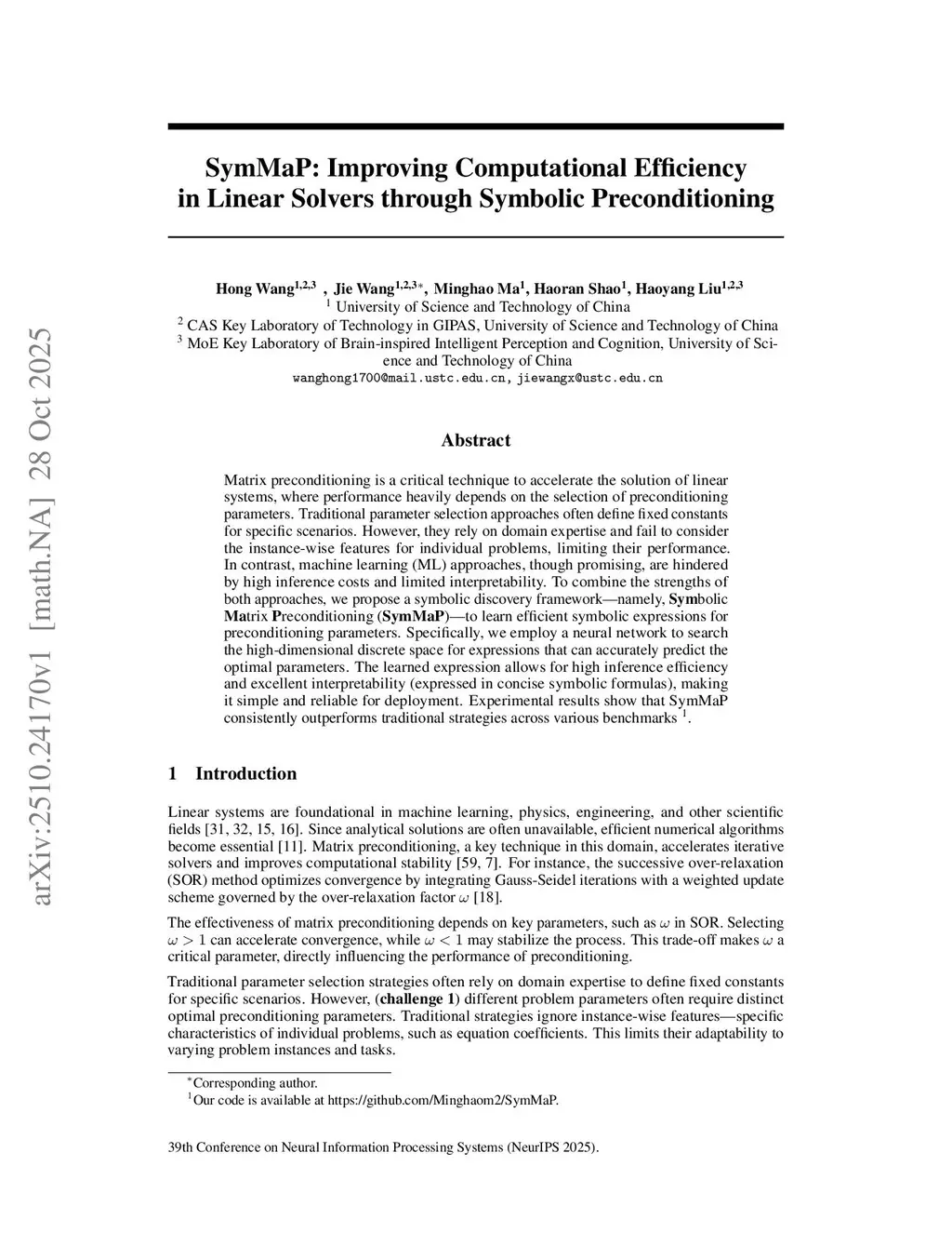 SymMaP: Improving Computational Efficiency in Linear Solvers through Symbolic Preconditioning