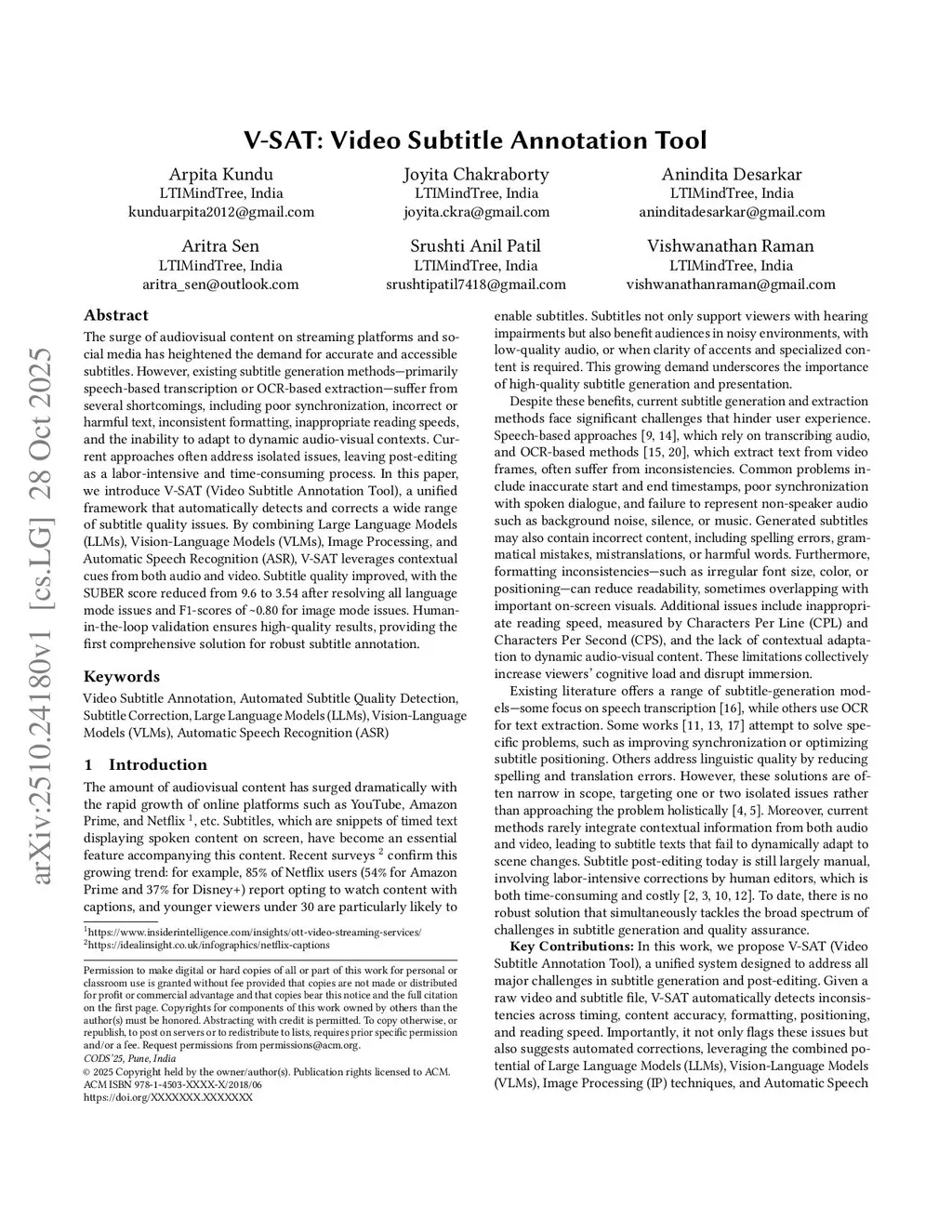 The surge of audiovisual content on streaming platforms and social media has heightened the demand for accurate and accessible subtitles. However, existing subtitle generation methods primarily speech-based transcription or OCR-based extraction suffer from several shortcomings, including poor synchronization, incorrect or harmful text, inconsistent formatting, inappropriate reading speeds, and the inability to adapt to dynamic audio-visual contexts. Current approaches often address isolated issues, leaving post-editing as a labor-intensive and time-consuming process. In this paper, we introduce V-SAT (Video Subtitle Annotation Tool), a unified framework that automatically detects and corrects a wide range of subtitle quality issues. By combining Large Language Models(LLMs), Vision-Language Models (VLMs), Image Processing, and Automatic Speech Recognition (ASR), V-SAT leverages contextual cues from both audio and video. Subtitle quality improved, with the SUBER score reduced from 9.6 to 3.54 after resolving all language mode issues and F1-scores of ~0.80 for image mode issues. Human-in-the-loop validation ensures high-quality results, providing the first comprehensive solution for robust subtitle annotation.