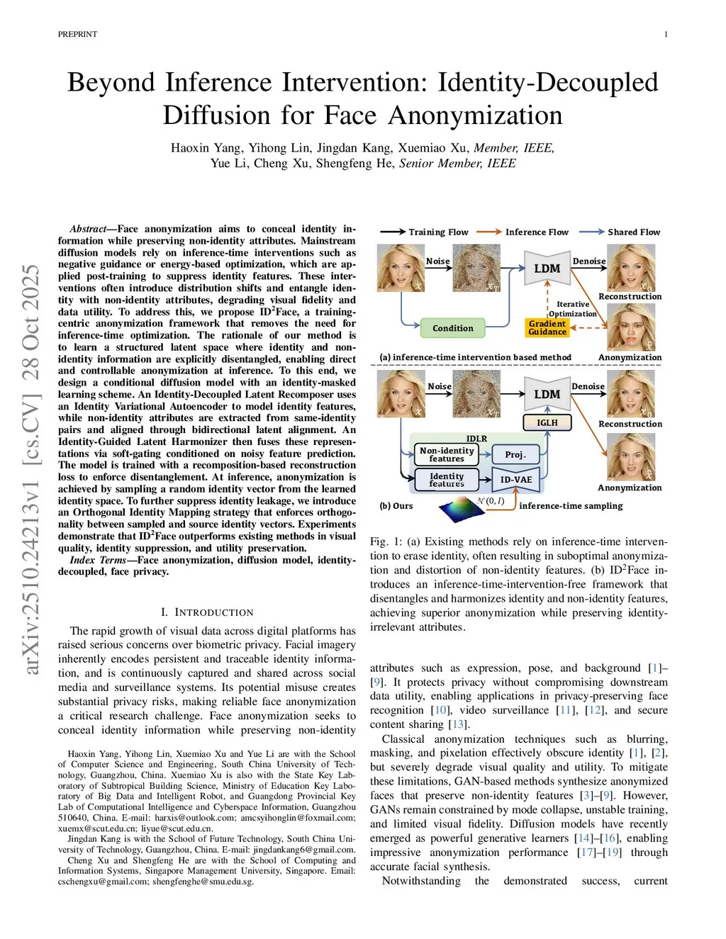 Face anonymization aims to conceal identity information while preserving non-identity attributes. Mainstream diffusion models rely on inference-time interventions such as negative guidance or energy-based optimization, which are applied post-training to suppress identity features. These interventions often introduce distribution shifts and entangle identity with non-identity attributes, degrading visual fidelity and data utility. To address this, we propose \textbf{ID\textsuperscript{2}Face}, a training-centric anonymization framework that removes the need for inference-time optimization. The rationale of our method is to learn a structured latent space where identity and non-identity information are explicitly disentangled, enabling direct and controllable anonymization at inference. To this end, we design a conditional diffusion model with an identity-masked learning scheme. An Identity-Decoupled Latent Recomposer uses an Identity Variational Autoencoder to model identity features, while non-identity attributes are extracted from same-identity pairs and aligned through bidirectional latent alignment. An Identity-Guided Latent Harmonizer then fuses these representations via soft-gating conditioned on noisy feature prediction. The model is trained with a recomposition-based reconstruction loss to enforce disentanglement. At inference, anonymization is achieved by sampling a random identity vector from the learned identity space. To further suppress identity leakage, we introduce an Orthogonal Identity Mapping strategy that enforces orthogonality between sampled and source identity vectors. Experiments demonstrate that ID\textsuperscript{2}Face outperforms existing methods in visual quality, identity suppression, and utility preservation.