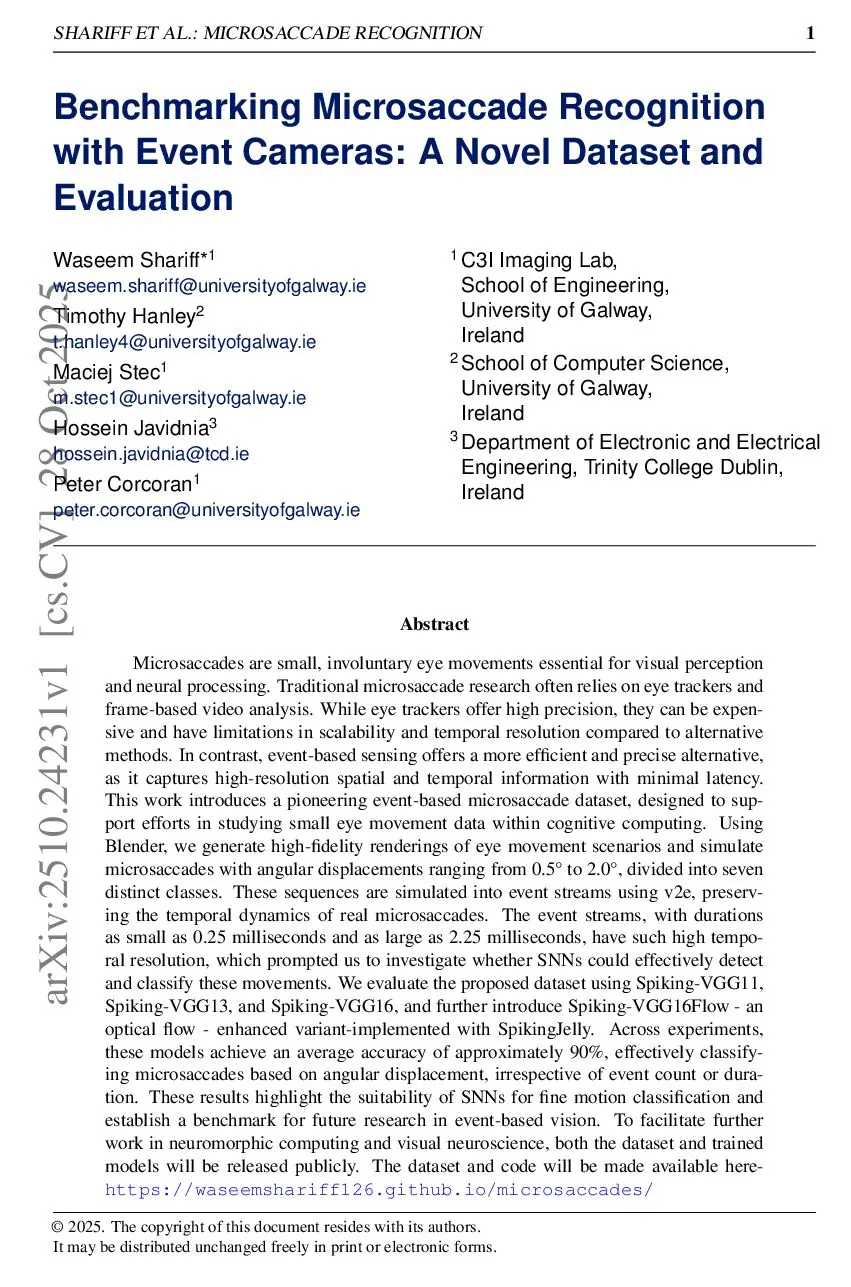 Microsaccades are small, involuntary eye movements vital for visual perception and neural processing. Traditional microsaccade studies typically use eye trackers or frame-based analysis, which, while precise, are costly and limited in scalability and temporal resolution. Event-based sensing offers a high-speed, low-latency alternative by capturing fine-grained spatiotemporal changes efficiently. This work introduces a pioneering event-based microsaccade dataset to support research on small eye movement dynamics in cognitive computing. Using Blender, we render high-fidelity eye movement scenarios and simulate microsaccades with angular displacements from 0.5 to 2.0 degrees, divided into seven distinct classes. These are converted to event streams using v2e, preserving the natural temporal dynamics of microsaccades, with durations ranging from 0.25 ms to 2.25 ms. We evaluate the dataset using Spiking-VGG11, Spiking-VGG13, and Spiking-VGG16, and propose Spiking-VGG16Flow, an optical-flow-enhanced variant implemented in SpikingJelly. The models achieve around 90 percent average accuracy, successfully classifying microsaccades by angular displacement, independent of event count or duration. These results demonstrate the potential of spiking neural networks for fine motion recognition and establish a benchmark for event-based vision research. The dataset, code, and trained models will be publicly available atthis https URL.