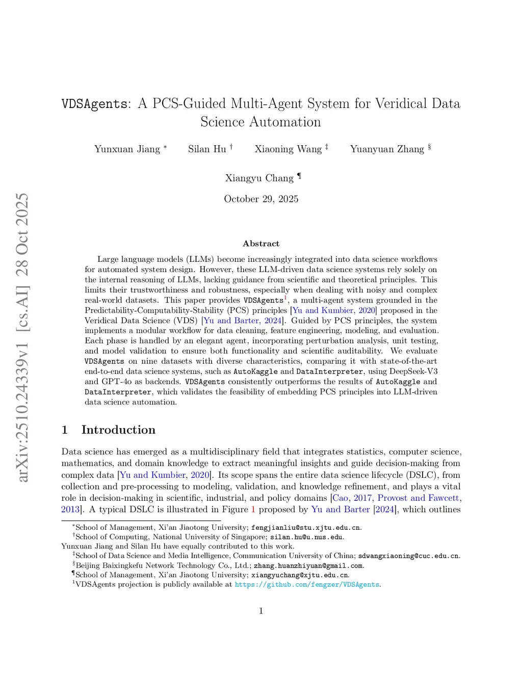 Large language models (LLMs) become increasingly integrated into data science workflows for automated system design. However, these LLM-driven data science systems rely solely on the internal reasoning of LLMs, lacking guidance from scientific and theoretical principles. This limits their trustworthiness and robustness, especially when dealing with noisy and complex real-world datasets. This paper provides VDSAgents, a multi-agent system grounded in the Predictability-Computability-Stability (PCS) principles proposed in the Veridical Data Science (VDS) framework. Guided by PCS principles, the system implements a modular workflow for data cleaning, feature engineering, modeling, and evaluation. Each phase is handled by an elegant agent, incorporating perturbation analysis, unit testing, and model validation to ensure both functionality and scientific auditability. We evaluate VDSAgents on nine datasets with diverse characteristics, comparing it with state-of-the-art end-to-end data science systems, such as AutoKaggle and DataInterpreter, using DeepSeek-V3 and GPT-4o as backends. VDSAgents consistently outperforms the results of AutoKaggle and DataInterpreter, which validates the feasibility of embedding PCS principles into LLM-driven data science automation.