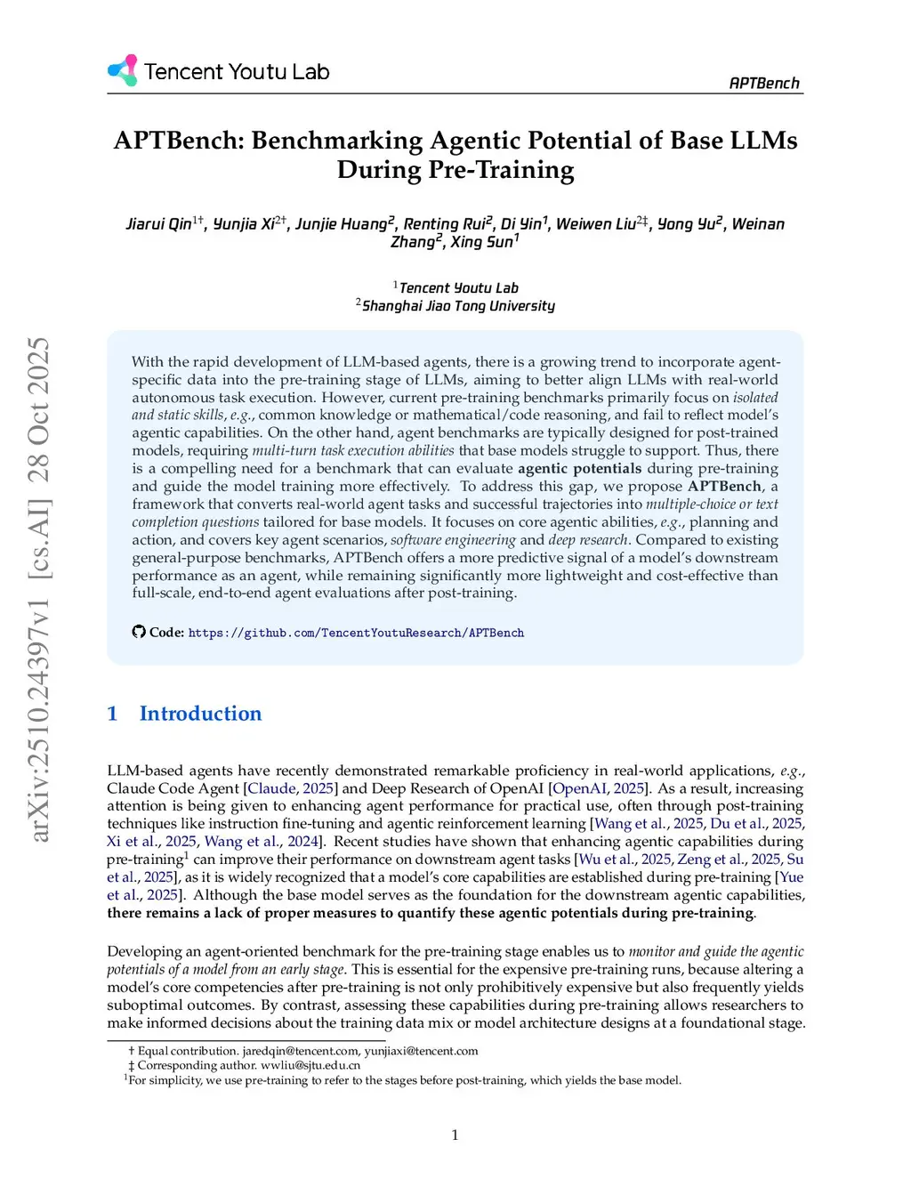 With the rapid development of LLM-based agents, there is a growing trend to incorporate agent-specific data into the pre-training stage of LLMs, aiming to better align LLMs with real-world autonomous task execution. However, current pre-training benchmarks primarily focus on isolated and static skills, e.g., common knowledge or mathematical/code reasoning, and fail to reflect model's agentic capabilities. On the other hand, agent benchmarks are typically designed for post-trained models, requiring multi-turn task execution abilities that base models struggle to support. Thus, there is a compelling need for a benchmark that can evaluate agentic potentials during pre-training and guide the model training more effectively. To address this gap, we propose APTBench, a framework that converts real-world agent tasks and successful trajectories into multiple-choice or text completion questions tailored for base models. It focuses on core agentic abilities, e.g., planning and action, and covers key agent scenarios, software engineering and deep research. Compared to existing general-purpose benchmarks, APTBench offers a more predictive signal of a model's downstream performance as an agent, while remaining significantly more lightweight and cost-effective than full-scale, end-to-end agent evaluations after post-training.