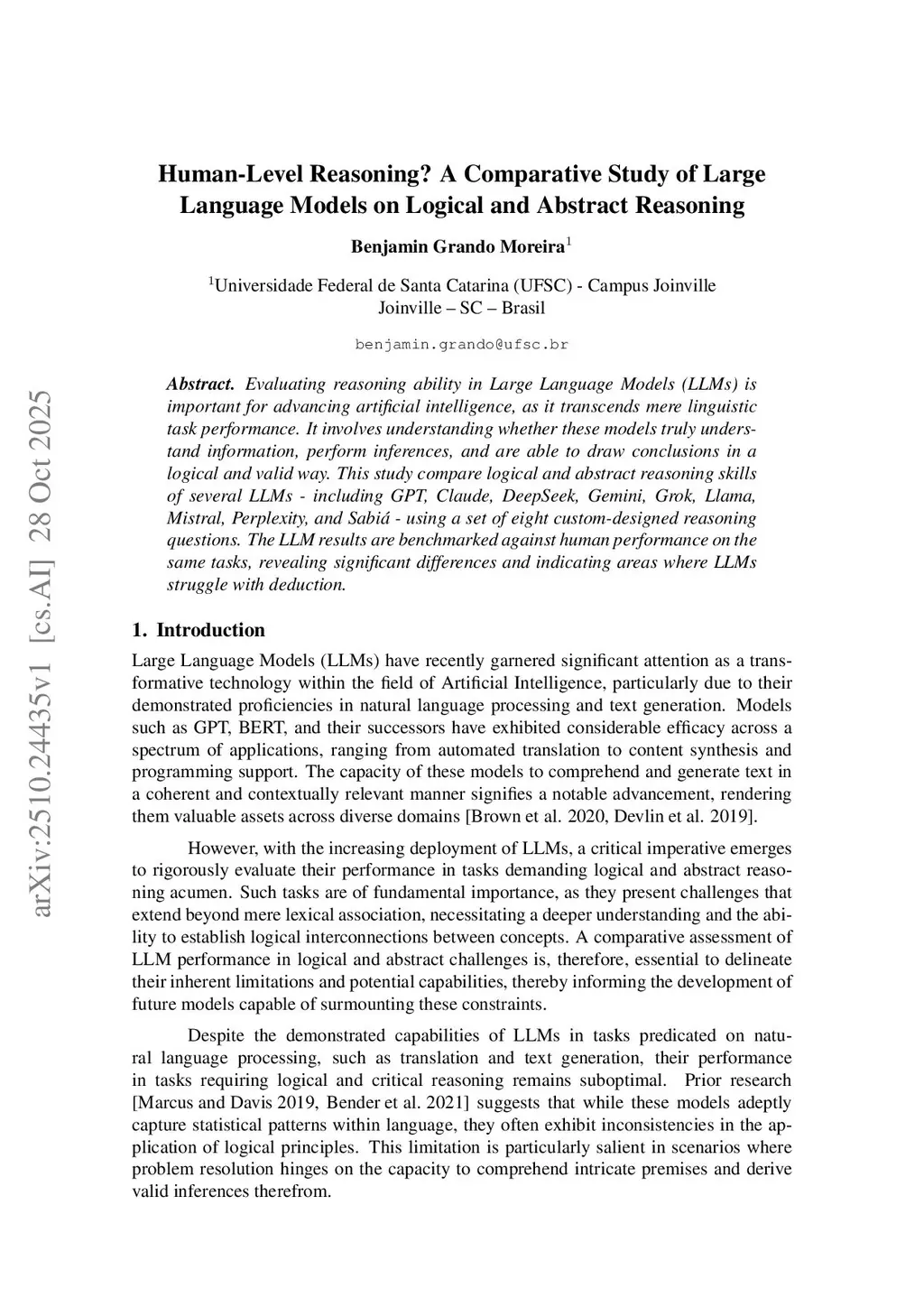 Evaluating reasoning ability in Large Language Models (LLMs) is important for advancing artificial intelligence, as it transcends mere linguistic task performance. It involves understanding whether these models truly understand information, perform inferences, and are able to draw conclusions in a logical and valid way. This study compare logical and abstract reasoning skills of several LLMs - including GPT, Claude, DeepSeek, Gemini, Grok, Llama, Mistral, Perplexity, and Sabiá - using a set of eight custom-designed reasoning questions. The LLM results are benchmarked against human performance on the same tasks, revealing significant differences and indicating areas where LLMs struggle with deduction.