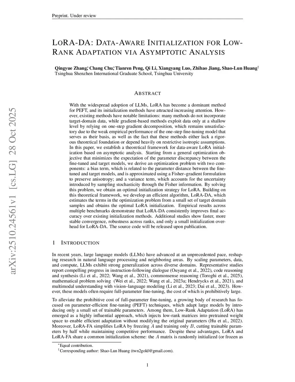 With the widespread adoption of LLMs, LoRA has become a dominant method for PEFT, and its initialization methods have attracted increasing attention. However, existing methods have notable limitations: many methods do not incorporate target-domain data, while gradient-based methods exploit data only at a shallow level by relying on one-step gradient decomposition, which remains unsatisfactory due to the weak empirical performance of the one-step fine-tuning model that serves as their basis, as well as the fact that these methods either lack a rigorous theoretical foundation or depend heavily on restrictive isotropic assumptions. In this paper, we establish a theoretical framework for data-aware LoRA initialization based on asymptotic analysis. Starting from a general optimization objective that minimizes the expectation of the parameter discrepancy between the fine-tuned and target models, we derive an optimization problem with two components: a bias term, which is related to the parameter distance between the fine-tuned and target models, and is approximated using a Fisher-gradient formulation to preserve anisotropy; and a variance term, which accounts for the uncertainty introduced by sampling stochasticity through the Fisher information. By solving this problem, we obtain an optimal initialization strategy for LoRA. Building on this theoretical framework, we develop an efficient algorithm, LoRA-DA, which estimates the terms in the optimization problem from a small set of target domain samples and obtains the optimal LoRA initialization. Empirical results across multiple benchmarks demonstrate that LoRA-DA consistently improves final accuracy over existing initialization methods. Additional studies show faster, more stable convergence, robustness across ranks, and only a small initialization overhead for LoRA-DA. The source code will be released upon publication.