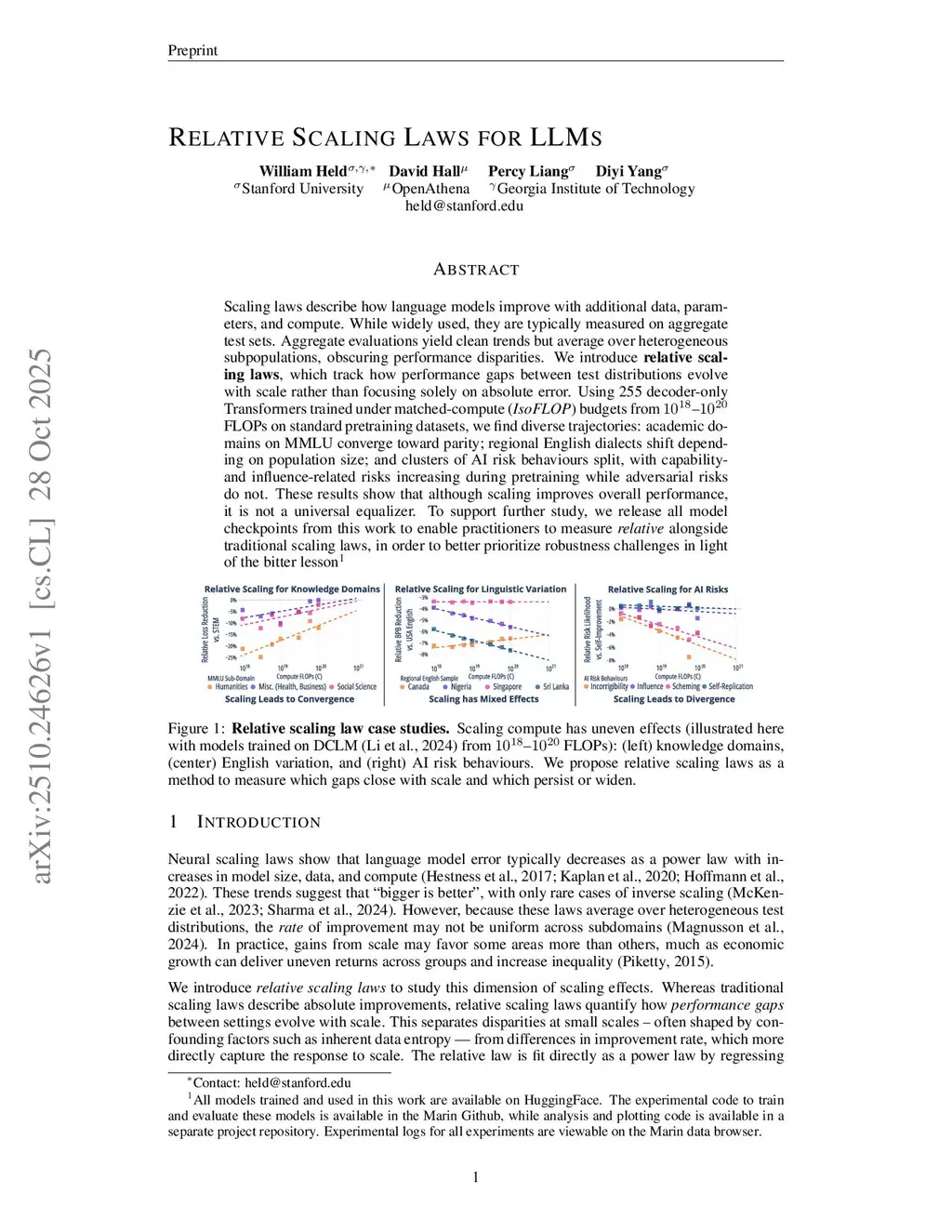 Scaling laws describe how language models improve with additional data, parameters, and compute. While widely used, they are typically measured on aggregate test sets. Aggregate evaluations yield clean trends but average over heterogeneous subpopulations, obscuring performance disparities. We introduce relative scaling laws, which track how performance gaps between test distributions evolve with scale rather than focusing solely on absolute error. Using 255 decoder-only Transformers trained under matched-compute (IsoFLOP) budgets from -- FLOPs on standard pretraining datasets, we find diverse trajectories: academic domains on MMLU converge toward parity; regional English dialects shift depending on population size; and clusters of AI risk behaviours split, with capability- and influence-related risks increasing during pretraining while adversarial risks do not. These results show that although scaling improves overall performance, it is not a universal equalizer. To support further study, we release all model checkpoints from this work to enable practitioners to measure relative alongside traditional scaling laws, in order to better prioritize robustness challenges in light of the bitter lesson.