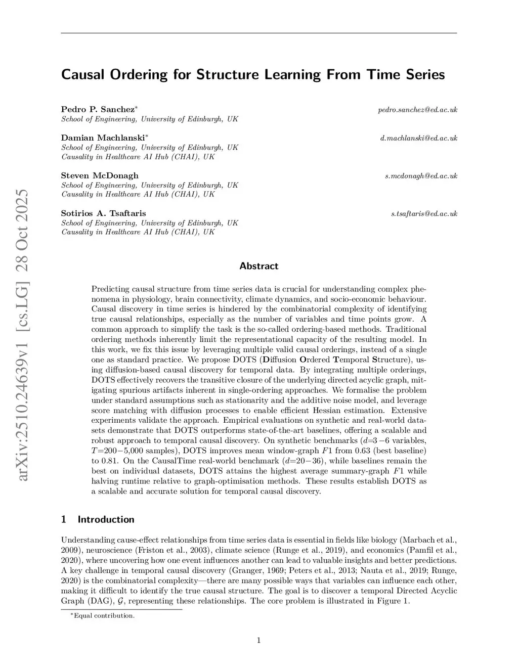 Predicting causal structure from time series data is crucial for understanding complex phenomena in physiology, brain connectivity, climate dynamics, and socio-economic behaviour. Causal discovery in time series is hindered by the combinatorial complexity of identifying true causal relationships, especially as the number of variables and time points grow. A common approach to simplify the task is the so-called ordering-based methods. Traditional ordering methods inherently limit the representational capacity of the resulting model. In this work, we fix this issue by leveraging multiple valid causal orderings, instead of a single one as standard practice. We propose DOTS (Diffusion Ordered Temporal Structure), using diffusion-based causal discovery for temporal data. By integrating multiple orderings, DOTS effectively recovers the transitive closure of the underlying directed acyclic graph, mitigating spurious artifacts inherent in single-ordering approaches. We formalise the problem under standard assumptions such as stationarity and the additive noise model, and leverage score matching with diffusion processes to enable efficient Hessian estimation. Extensive experiments validate the approach. Empirical evaluations on synthetic and real-world datasets demonstrate that DOTS outperforms state-of-the-art baselines, offering a scalable and robust approach to temporal causal discovery. On synthetic benchmarks ( variables, samples), DOTS improves mean window-graph from (best baseline) to . On the CausalTime real-world benchmark (), while baselines remain the best on individual datasets, DOTS attains the highest average summary-graph while halving runtime relative to graph-optimisation methods. These results establish DOTS as a scalable and accurate solution for temporal causal discovery.