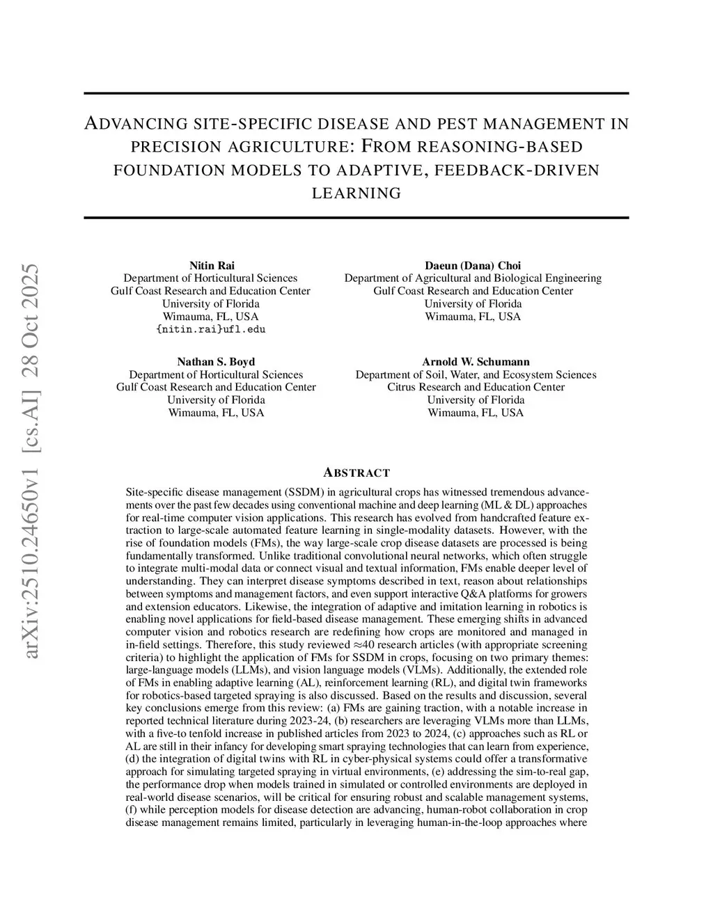 Site-specific disease management (SSDM) in crops has advanced rapidly through machine and deep learning (ML and DL) for real-time computer vision. Research evolved from handcrafted feature extraction to large-scale automated feature learning. With foundation models (FMs), crop disease datasets are now processed in fundamentally new ways. Unlike traditional neural networks, FMs integrate visual and textual data, interpret symptoms in text, reason about symptom-management relationships, and support interactive QA for growers and educators. Adaptive and imitation learning in robotics further enables field-based disease management. This review screened approx. 40 articles on FM applications for SSDM, focusing on large-language models (LLMs) and vision-language models (VLMs), and discussing their role in adaptive learning (AL), reinforcement learning (RL), and digital twin frameworks for targeted spraying. Key findings: (a) FMs are gaining traction with surging literature in 2023-24; (b) VLMs outpace LLMs, with a 5-10x increase in publications; (c) RL and AL are still nascent for smart spraying; (d) digital twins with RL can simulate targeted spraying virtually; (e) addressing the sim-to-real gap is critical for real-world deployment; (f) human-robot collaboration remains limited, especially in human-in-the-loop approaches where robots detect early symptoms and humans validate uncertain cases; (g) multi-modal FMs with real-time feedback will drive next-gen SSDM. For updates, resources, and contributions, visit,this https URL, to submit papers, code, or datasets.