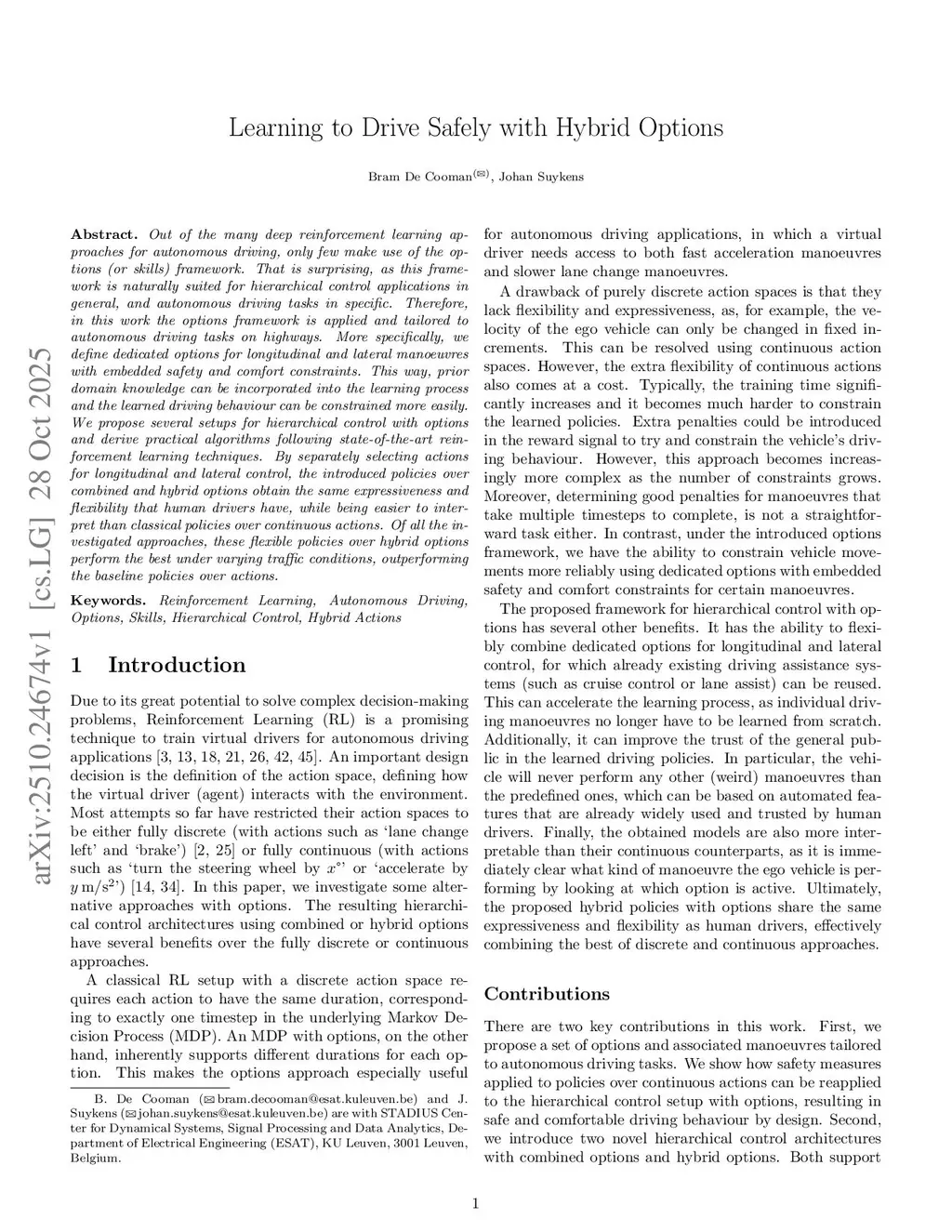 Learning to Drive Safely with Hybrid Options