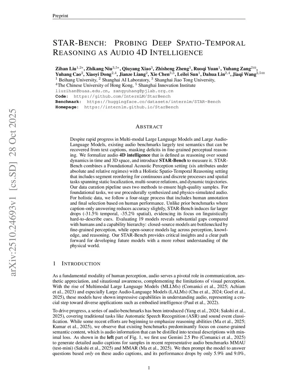 Despite rapid progress in Multi-modal Large Language Models and Large Audio-Language Models, existing audio benchmarks largely test semantics that can be recovered from text captions, masking deficits in fine-grained perceptual reasoning. We formalize audio 4D intelligence that is defined as reasoning over sound dynamics in time and 3D space, and introduce STAR-Bench to measure it. STAR-Bench combines a Foundational Acoustic Perception setting (six attributes under absolute and relative regimes) with a Holistic Spatio-Temporal Reasoning setting that includes segment reordering for continuous and discrete processes and spatial tasks spanning static localization, multi-source relations, and dynamic trajectories. Our data curation pipeline uses two methods to ensure high-quality samples. For foundational tasks, we use procedurally synthesized and physics-simulated audio. For holistic data, we follow a four-stage process that includes human annotation and final selection based on human performance. Unlike prior benchmarks where caption-only answering reduces accuracy slightly, STAR-Bench induces far larger drops (-31.5\% temporal, -35.2\% spatial), evidencing its focus on linguistically hard-to-describe cues. Evaluating 19 models reveals substantial gaps compared with humans and a capability hierarchy: closed-source models are bottlenecked by fine-grained perception, while open-source models lag across perception, knowledge, and reasoning. Our STAR-Bench provides critical insights and a clear path forward for developing future models with a more robust understanding of the physical world.