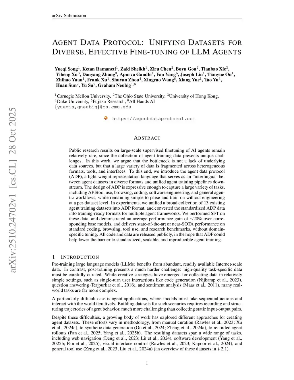 Public research results on large-scale supervised finetuning of AI agents remain relatively rare, since the collection of agent training data presents unique challenges. In this work, we argue that the bottleneck is not a lack of underlying data sources, but that a large variety of data is fragmented across heterogeneous formats, tools, and interfaces. To this end, we introduce the agent data protocol (ADP), a light-weight representation language that serves as an "interlingua" between agent datasets in diverse formats and unified agent training pipelines downstream. The design of ADP is expressive enough to capture a large variety of tasks, including API/tool use, browsing, coding, software engineering, and general agentic workflows, while remaining simple to parse and train on without engineering at a per-dataset level. In experiments, we unified a broad collection of 13 existing agent training datasets into ADP format, and converted the standardized ADP data into training-ready formats for multiple agent frameworks. We performed SFT on these data, and demonstrated an average performance gain of ~20% over corresponding base models, and delivers state-of-the-art or near-SOTA performance on standard coding, browsing, tool use, and research benchmarks, without domain-specific tuning. All code and data are released publicly, in the hope that ADP could help lower the barrier to standardized, scalable, and reproducible agent training.