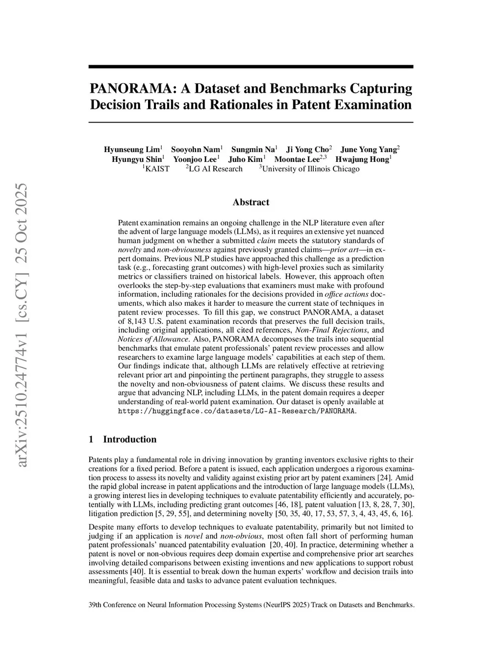 PANORAMA: A Dataset and Benchmarks Capturing Decision Trails and Rationales in Patent Examination