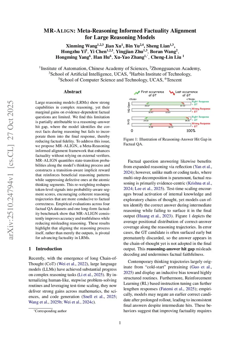 Large reasoning models (LRMs) show strong capabilities in complex reasoning, yet their marginal gains on evidence-dependent factual questions are limited. We find this limitation is partially attributable to a reasoning-answer hit gap, where the model identifies the correct facts during reasoning but fails to incorporate them into the final response, thereby reducing factual fidelity. To address this issue, we propose MR-ALIGN, a Meta-Reasoning informed alignment framework that enhances factuality without relying on external verifiers. MR-ALIGN quantifies state transition probabilities along the model's thinking process and constructs a transition-aware implicit reward that reinforces beneficial reasoning patterns while suppressing defective ones at the atomic thinking segments. This re-weighting reshapes token-level signals into probability-aware segment scores, encouraging coherent reasoning trajectories that are more conducive to factual correctness. Empirical evaluations across four factual QA datasets and one long-form factuality benchmark show that MR-ALIGN consistently improves accuracy and truthfulness while reducing misleading reasoning. These results highlight that aligning the reasoning process itself, rather than merely the outputs, is pivotal for advancing factuality in LRMs.