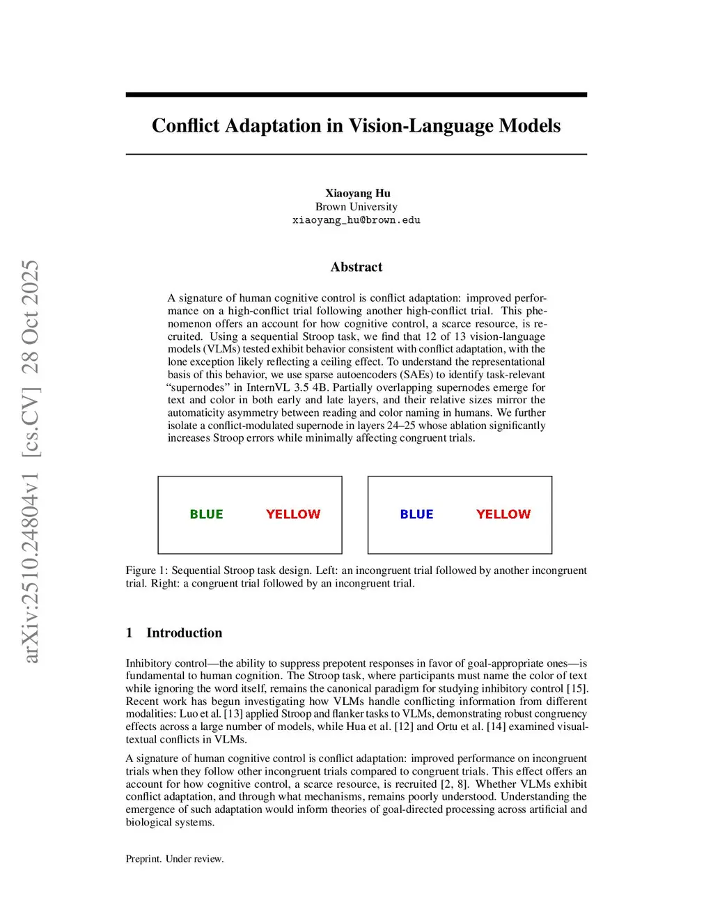 A signature of human cognitive control is conflict adaptation: improved performance on a high-conflict trial following another high-conflict trial. This phenomenon offers an account for how cognitive control, a scarce resource, is recruited. Using a sequential Stroop task, we find that 12 of 13 vision-language models (VLMs) tested exhibit behavior consistent with conflict adaptation, with the lone exception likely reflecting a ceiling effect. To understand the representational basis of this behavior, we use sparse autoencoders (SAEs) to identify task-relevant supernodes in InternVL 3.5 4B. Partially overlapping supernodes emerge for text and color in both early and late layers, and their relative sizes mirror the automaticity asymmetry between reading and color naming in humans. We further isolate a conflict-modulated supernode in layers 24-25 whose ablation significantly increases Stroop errors while minimally affecting congruent trials.