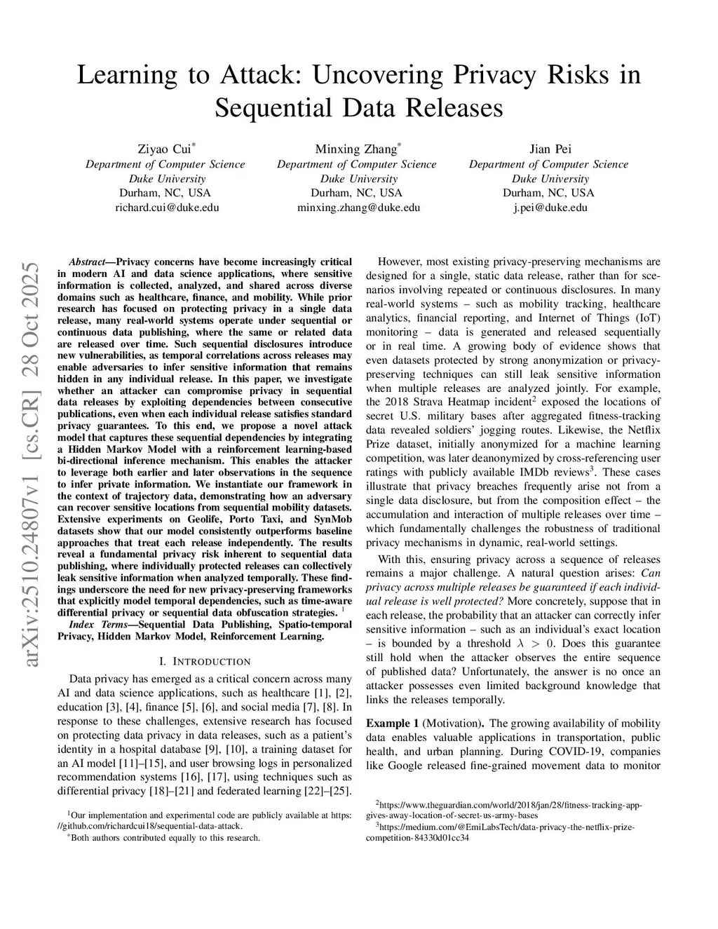 Privacy concerns have become increasingly critical in modern AI and data science applications, where sensitive information is collected, analyzed, and shared across diverse domains such as healthcare, finance, and mobility. While prior research has focused on protecting privacy in a single data release, many real-world systems operate under sequential or continuous data publishing, where the same or related data are released over time. Such sequential disclosures introduce new vulnerabilities, as temporal correlations across releases may enable adversaries to infer sensitive information that remains hidden in any individual release. In this paper, we investigate whether an attacker can compromise privacy in sequential data releases by exploiting dependencies between consecutive publications, even when each individual release satisfies standard privacy guarantees. To this end, we propose a novel attack model that captures these sequential dependencies by integrating a Hidden Markov Model with a reinforcement learning-based bi-directional inference mechanism. This enables the attacker to leverage both earlier and later observations in the sequence to infer private information. We instantiate our framework in the context of trajectory data, demonstrating how an adversary can recover sensitive locations from sequential mobility datasets. Extensive experiments on Geolife, Porto Taxi, and SynMob datasets show that our model consistently outperforms baseline approaches that treat each release independently. The results reveal a fundamental privacy risk inherent to sequential data publishing, where individually protected releases can collectively leak sensitive information when analyzed temporally. These findings underscore the need for new privacy-preserving frameworks that explicitly model temporal dependencies, such as time-aware differential privacy or sequential data obfuscation strategies.