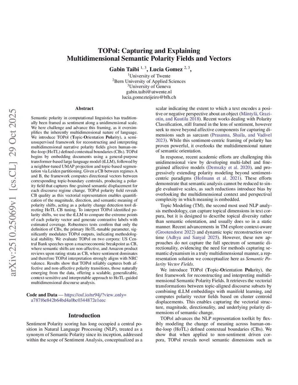 Traditional approaches to semantic polarity in computational linguistics treat sentiment as a unidimensional scale, overlooking the multidimensional structure of language. This work introduces TOPol (Topic-Orientation POLarity), a semi-unsupervised framework for reconstructing and interpreting multidimensional narrative polarity fields under human-on-the-loop (HoTL) defined contextual boundaries (CBs). The framework embeds documents using a transformer-based large language model (tLLM), applies neighbor-tuned UMAP projection, and segments topics via Leiden partitioning. Given a CB between discourse regimes A and B, TOPol computes directional vectors between corresponding topic-boundary centroids, yielding a polarity field that quantifies fine-grained semantic displacement during regime shifts. This vectorial representation enables assessing CB quality and detecting polarity changes, guiding HoTL CB refinement. To interpret identified polarity vectors, the tLLM compares their extreme points and produces contrastive labels with estimated coverage. Robustness analyses show that only CB definitions (the main HoTL-tunable parameter) significantly affect results, confirming methodological stability. We evaluate TOPol on two corpora: (i) U.S. Central Bank speeches around a macroeconomic breakpoint, capturing non-affective semantic shifts, and (ii) Amazon product reviews across rating strata, where affective polarity aligns with NRC valence. Results demonstrate that TOPol consistently captures both affective and non-affective polarity transitions, providing a scalable, generalizable, and interpretable framework for context-sensitive multidimensional discourse analysis.