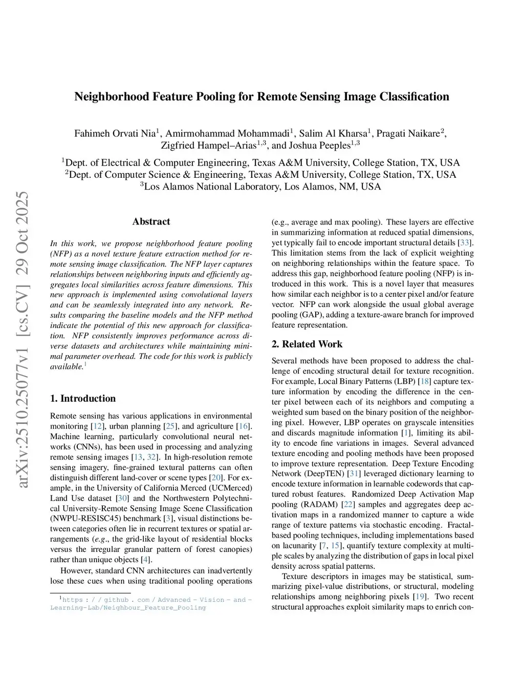 In this work, we introduce Neighborhood Feature Pooling (NFP), a novel pooling layer designed to enhance texture-aware representation learning for remote sensing image classification. The proposed NFP layer captures relationships between neighboring spatial features by aggregating local similarity patterns across feature dimensions. Implemented using standard convolutional operations, NFP can be seamlessly integrated into existing neural network architectures with minimal additional parameters. Extensive experiments across multiple benchmark datasets and backbone models demonstrate that NFP consistently improves classification performance compared to conventional pooling strategies, while maintaining computational efficiency. These results highlight the effectiveness of neighborhood-based feature aggregation for capturing discriminative texture information in remote sensing imagery.