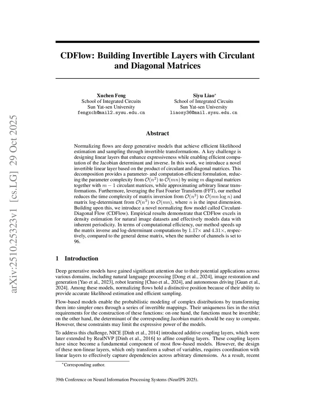 Normalizing flows are deep generative models that enable efficient likelihood estimation and sampling through invertible transformations. A key challenge is to design linear layers that enhance expressiveness while maintaining efficient computation of the Jacobian determinant and inverse. We introduce a novel invertible linear layer based on the product of circulant and diagonal matrices. This decomposition reduces parameter complexity from to using diagonal matrices and circulant matrices while still approximating general linear transformations. By leveraging the Fast Fourier Transform, our approach reduces the time complexity of matrix inversion from to and that of computing the log-determinant from to , where is the input dimension. We build upon this layer to develop Circulant-Diagonal Flow (CDFlow), which achieves strong density estimation on natural image datasets and effectively models data with inherent periodic structure. Furthermore, CDFlow significantly accelerates key operations in normalizing flows, providing practical benefits for scalable generative modeling.