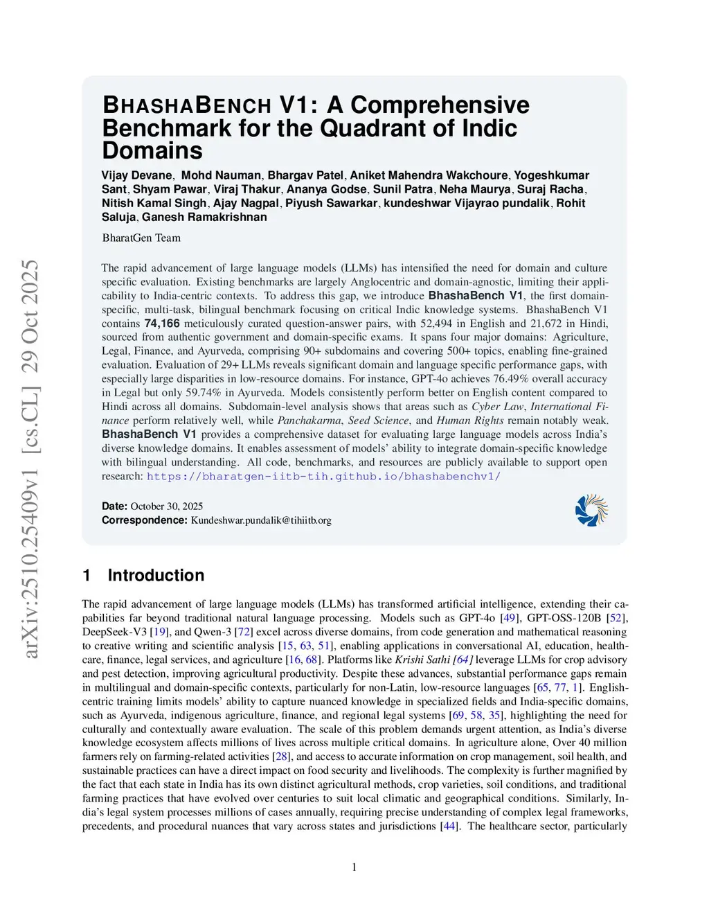 BhashaBench V1: A Comprehensive Benchmark for the Quadrant of Indic Domains