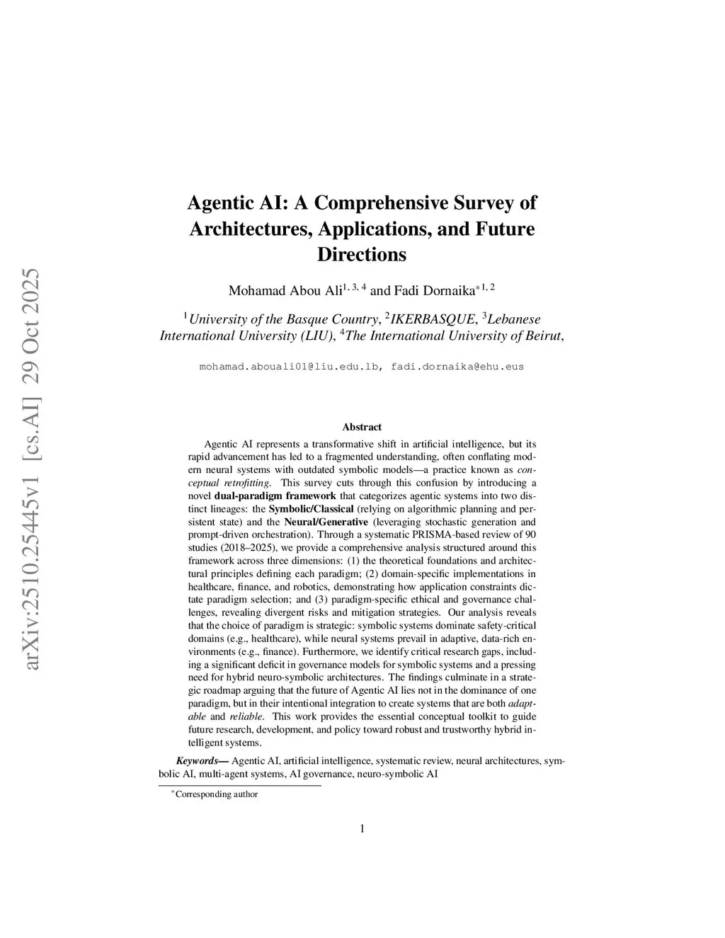 Agentic AI represents a transformative shift in artificial intelligence, but its rapid advancement has led to a fragmented understanding, often conflating modern neural systems with outdated symbolic models -- a practice known as conceptual retrofitting. This survey cuts through this confusion by introducing a novel dual-paradigm framework that categorizes agentic systems into two distinct lineages: the Symbolic/Classical (relying on algorithmic planning and persistent state) and the Neural/Generative (leveraging stochastic generation and prompt-driven orchestration). Through a systematic PRISMA-based review of 90 studies (2018--2025), we provide a comprehensive analysis structured around this framework across three dimensions: (1) the theoretical foundations and architectural principles defining each paradigm; (2) domain-specific implementations in healthcare, finance, and robotics, demonstrating how application constraints dictate paradigm selection; and (3) paradigm-specific ethical and governance challenges, revealing divergent risks and mitigation strategies. Our analysis reveals that the choice of paradigm is strategic: symbolic systems dominate safety-critical domains (e.g., healthcare), while neural systems prevail in adaptive, data-rich environments (e.g., finance). Furthermore, we identify critical research gaps, including a significant deficit in governance models for symbolic systems and a pressing need for hybrid neuro-symbolic architectures. The findings culminate in a strategic roadmap arguing that the future of Agentic AI lies not in the dominance of one paradigm, but in their intentional integration to create systems that are both adaptable and reliable. This work provides the essential conceptual toolkit to guide future research, development, and policy toward robust and trustworthy hybrid intelligent systems.