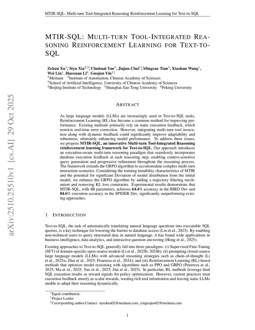 As large language models (LLMs) are increasingly used in Text-to-SQL tasks, Reinforcement Learning (RL) has become a common method for improving performance. Existing methods primarily rely on static execution feedback, which restricts real-time error correction. However, integrating multi-turn tool invocation along with dynamic feedback could significantly improve adaptability and robustness, ultimately enhancing model performance. To address these issues, we propose MTIR-SQL, an innovative Multi-turn Tool-Integrated Reasoning reinforcement learning framework for Text-to-SQL. Our approach introduces an execution-aware multi-turn reasoning paradigm that seamlessly incorporates database execution feedback at each reasoning step, enabling context-sensitive query generation and progressive refinement throughout the reasoning process. The framework extends the GRPO algorithm to accommodate complex multi-turn interaction scenarios. Considering the training instability characteristics of MTIR and the potential for significant Deviation of model distribution from the initial model, we enhance the GRPO algorithm by adding a trajectory filtering mechanism and removing KL loss constraints. Experimental results demonstrate that MTIR-SQL, with 4B parameters, achieves \textbf{64.4}\% accuracy in the BIRD Dev and 84.6% execution accuracy in the SPIDER Dev, significantly outperforming existing approaches.