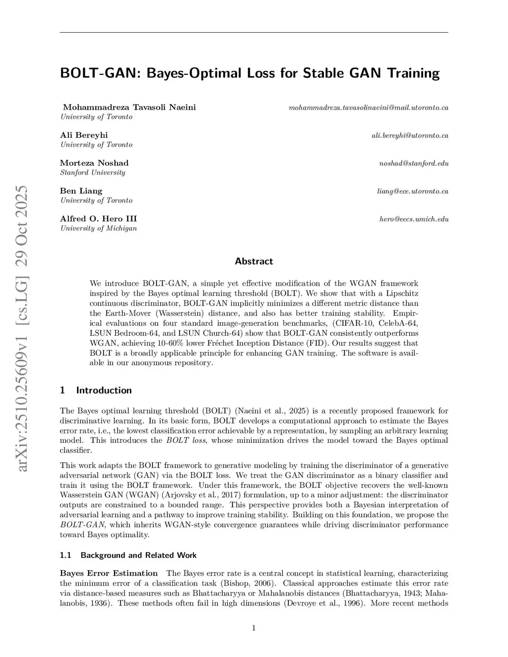 We introduce BOLT-GAN, a simple yet effective modification of the WGAN framework inspired by the Bayes Optimal Learning Threshold (BOLT). We show that with a Lipschitz continuous discriminator, BOLT-GAN implicitly minimizes a different metric distance than the Earth Mover (Wasserstein) distance and achieves better training stability. Empirical evaluations on four standard image generation benchmarks (CIFAR-10, CelebA-64, LSUN Bedroom-64, and LSUN Church-64) show that BOLT-GAN consistently outperforms WGAN, achieving 10-60% lower Frechet Inception Distance (FID). Our results suggest that BOLT is a broadly applicable principle for enhancing GAN training.