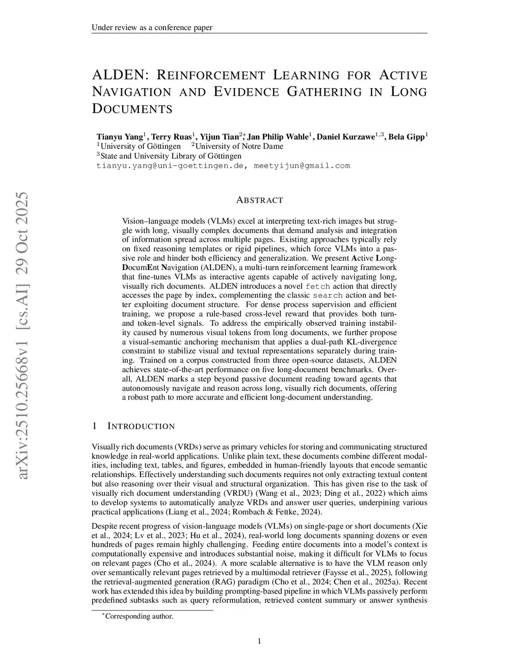 ALDEN: Reinforcement Learning for Active Navigation and Evidence Gathering in Long Documents