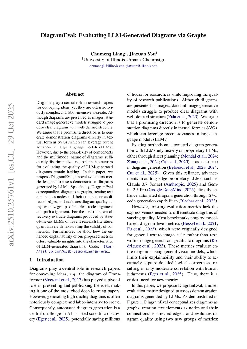Diagrams play a central role in research papers for conveying ideas, yet they are often notoriously complex and labor-intensive to create. Although diagrams are presented as images, standard image generative models struggle to produce clear diagrams with well-defined structure. We argue that a promising direction is to generate demonstration diagrams directly in textual form as SVGs, which can leverage recent advances in large language models (LLMs). However, due to the complexity of components and the multimodal nature of diagrams, sufficiently discriminative and explainable metrics for evaluating the quality of LLM-generated diagrams remain lacking. In this paper, we propose DiagramEval, a novel evaluation metric designed to assess demonstration diagrams generated by LLMs. Specifically, DiagramEval conceptualizes diagrams as graphs, treating text elements as nodes and their connections as directed edges, and evaluates diagram quality using two new groups of metrics: node alignment and path alignment. For the first time, we effectively evaluate diagrams produced by state-of-the-art LLMs on recent research literature, quantitatively demonstrating the validity of our metrics. Furthermore, we show how the enhanced explainability of our proposed metrics offers valuable insights into the characteristics of LLM-generated diagrams. Code:this https URL.