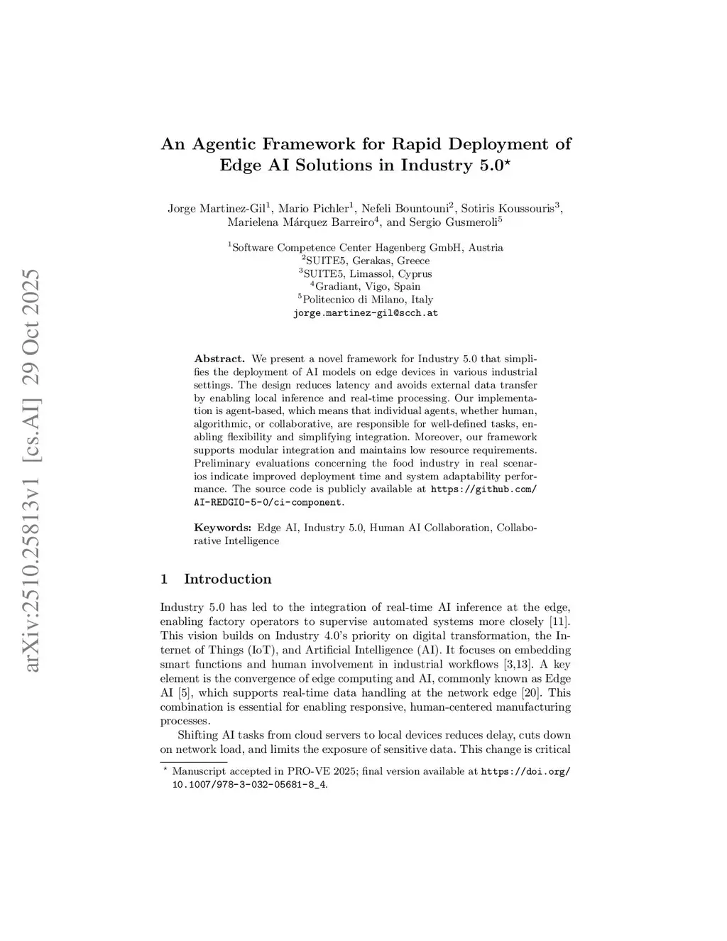 We present a novel framework for Industry 5.0 that simplifies the deployment of AI models on edge devices in various industrial settings. The design reduces latency and avoids external data transfer by enabling local inference and real-time processing. Our implementation is agent-based, which means that individual agents, whether human, algorithmic, or collaborative, are responsible for well-defined tasks, enabling flexibility and simplifying integration. Moreover, our framework supports modular integration and maintains low resource requirements. Preliminary evaluations concerning the food industry in real scenarios indicate improved deployment time and system adaptability performance. The source code is publicly available atthis https URL.