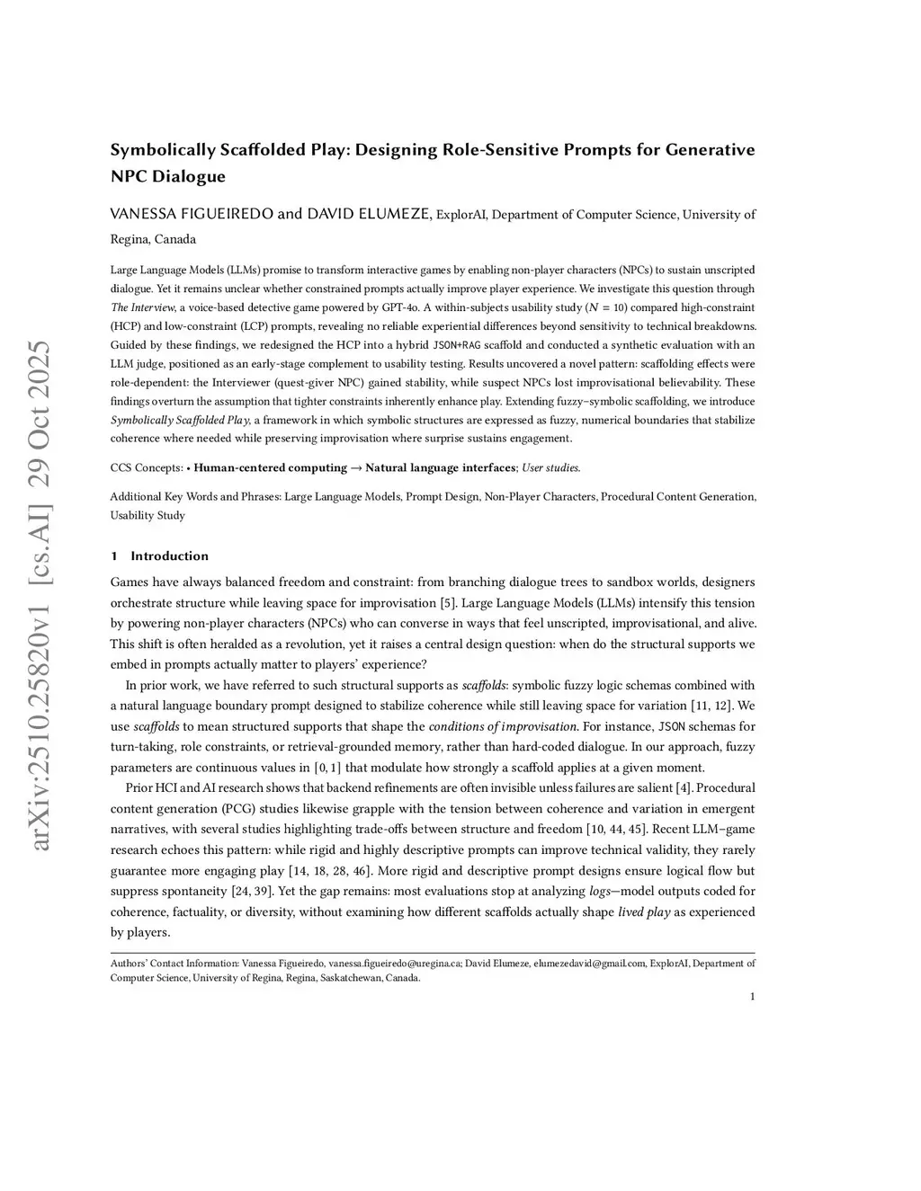 Large Language Models (LLMs) promise to transform interactive games by enabling non-player characters (NPCs) to sustain unscripted dialogue. Yet it remains unclear whether constrained prompts actually improve player experience. We investigate this question through The Interview, a voice-based detective game powered by GPT-4o. A within-subjects usability study () compared high-constraint (HCP) and low-constraint (LCP) prompts, revealing no reliable experiential differences beyond sensitivity to technical breakdowns. Guided by these findings, we redesigned the HCP into a hybrid JSON+RAG scaffold and conducted a synthetic evaluation with an LLM judge, positioned as an early-stage complement to usability testing. Results uncovered a novel pattern: scaffolding effects were role-dependent: the Interviewer (quest-giver NPC) gained stability, while suspect NPCs lost improvisational believability. These findings overturn the assumption that tighter constraints inherently enhance play. Extending fuzzy-symbolic scaffolding, we introduce \textit{Symbolically Scaffolded Play}, a framework in which symbolic structures are expressed as fuzzy, numerical boundaries that stabilize coherence where needed while preserving improvisation where surprise sustains engagement.