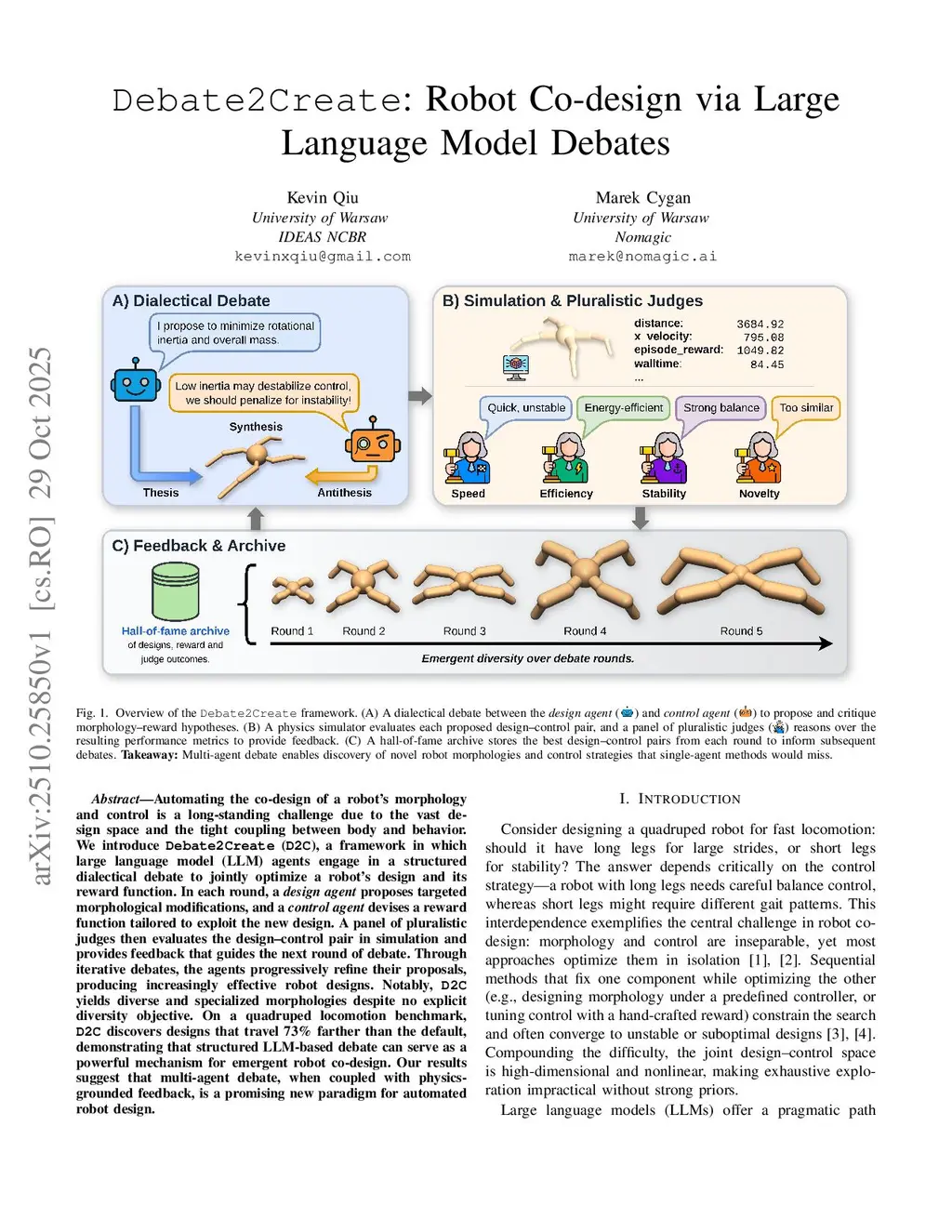Automating the co-design of a robot's morphology and control is a long-standing challenge due to the vast design space and the tight coupling between body and behavior. We introduce Debate2Create (D2C), a framework in which large language model (LLM) agents engage in a structured dialectical debate to jointly optimize a robot's design and its reward function. In each round, a design agent proposes targeted morphological modifications, and a control agent devises a reward function tailored to exploit the new design. A panel of pluralistic judges then evaluates the design-control pair in simulation and provides feedback that guides the next round of debate. Through iterative debates, the agents progressively refine their proposals, producing increasingly effective robot designs. Notably, D2C yields diverse and specialized morphologies despite no explicit diversity objective. On a quadruped locomotion benchmark, D2C discovers designs that travel 73% farther than the default, demonstrating that structured LLM-based debate can serve as a powerful mechanism for emergent robot co-design. Our results suggest that multi-agent debate, when coupled with physics-grounded feedback, is a promising new paradigm for automated robot design.