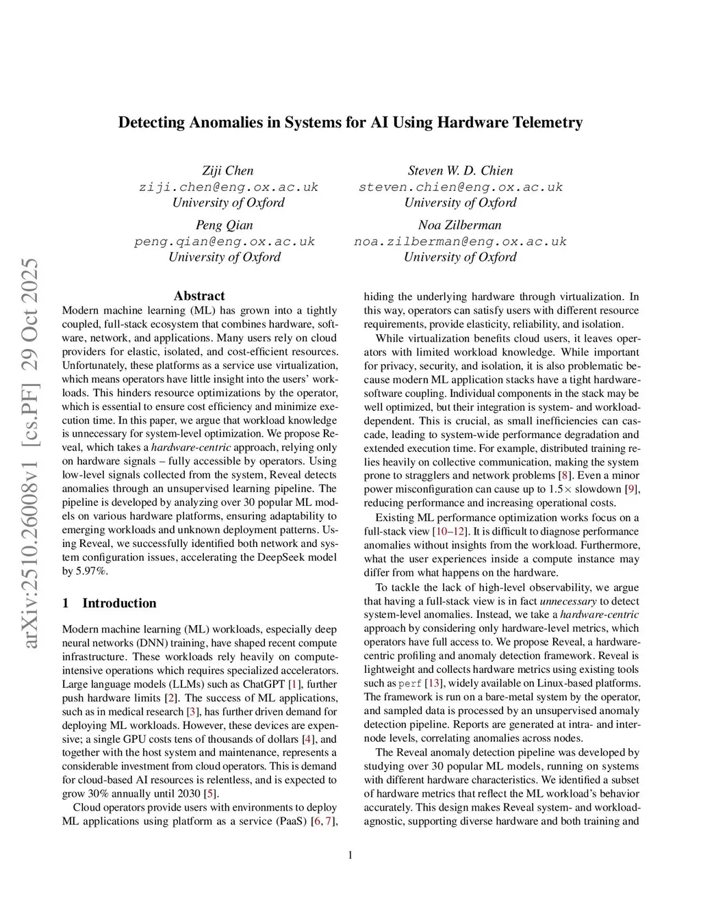 Modern machine learning (ML) has grown into a tightly coupled, full-stack ecosystem that combines hardware, software, network, and applications. Many users rely on cloud providers for elastic, isolated, and cost-efficient resources. Unfortunately, these platforms as a service use virtualization, which means operators have little insight into the users' workloads. This hinders resource optimizations by the operator, which is essential to ensure cost efficiency and minimize execution time. In this paper, we argue that workload knowledge is unnecessary for system-level optimization. We propose Reveal, which takes a hardware-centric approach, relying only on hardware signals - fully accessible by operators. Using low-level signals collected from the system, Reveal detects anomalies through an unsupervised learning pipeline. The pipeline is developed by analyzing over 30 popular ML models on various hardware platforms, ensuring adaptability to emerging workloads and unknown deployment patterns. Using Reveal, we successfully identified both network and system configuration issues, accelerating the DeepSeek model by 5.97%.