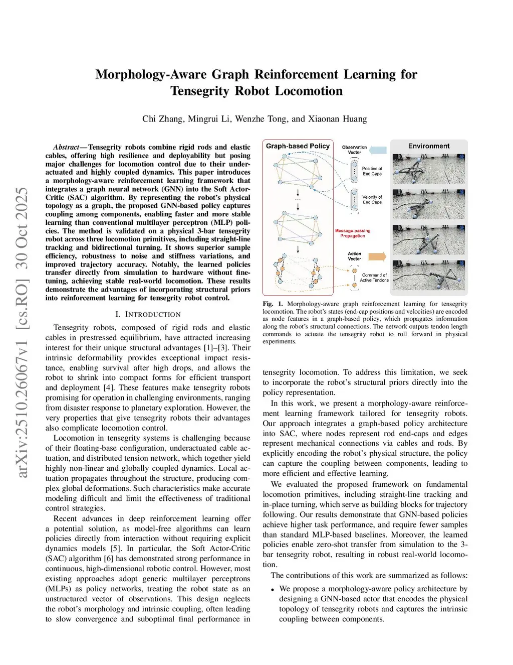Tensegrity robots combine rigid rods and elastic cables, offering high resilience and deployability but posing major challenges for locomotion control due to their underactuated and highly coupled dynamics. This paper introduces a morphology-aware reinforcement learning framework that integrates a graph neural network (GNN) into the Soft Actor-Critic (SAC) algorithm. By representing the robot's physical topology as a graph, the proposed GNN-based policy captures coupling among components, enabling faster and more stable learning than conventional multilayer perceptron (MLP) policies. The method is validated on a physical 3-bar tensegrity robot across three locomotion primitives, including straight-line tracking and bidirectional turning. It shows superior sample efficiency, robustness to noise and stiffness variations, and improved trajectory accuracy. Notably, the learned policies transfer directly from simulation to hardware without fine-tuning, achieving stable real-world locomotion. These results demonstrate the advantages of incorporating structural priors into reinforcement learning for tensegrity robot control.