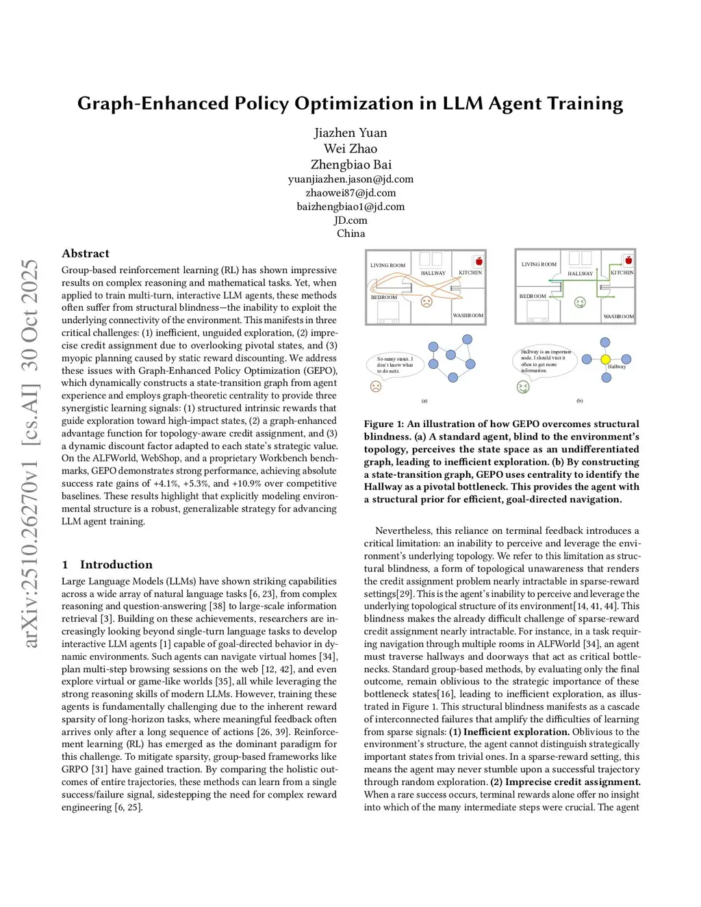 Group based reinforcement learning (RL) has shown impressive results on complex reasoning and mathematical tasks. Yet, when applied to train multi-turn, interactive LLM agents, these methods often suffer from structural blindness-the inability to exploit the underlying connectivity of the environment. This manifests in three critical challenges: (1) inefficient, unguided exploration, (2) imprecise credit assignment due to overlooking pivotal states, and (3) myopic planning caused by static reward discounting. We address these issues with Graph-Enhanced Policy Optimization (GEPO), which dynamically constructs a state-transition graph from agent experience and employs graph-theoretic centrality to provide three synergistic learning signals: (1)structured intrinsic rewards that guide exploration toward high-impact states, (2) a graph-enhanced advantage function for topology-aware credit assignment, and (3) a dynamic discount factor adapted to each state's strategic value. On the ALFWorld, WebShop, and a proprietary Workbench benchmarks, GEPO demonstrates strong performance, achieving absolute success rate gains of +4.1%, +5.3%, and +10.9% over competitive baselines. These results highlight that explicitly modeling environmental structure is a robust, generalizable strategy for advancing LLM agent training.