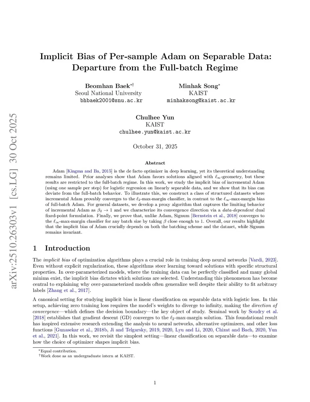 Implicit Bias of Per-sample Adam on Separable Data: Departure from the Full-batch Regime