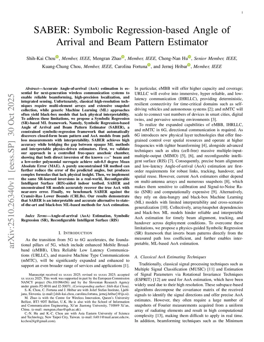 Accurate Angle-of-arrival (AoA) estimation is essential for next-generation wireless communication systems to enable reliable beamforming, high-precision localization, and integrated sensing. Unfortunately, classical high-resolution techniques require multi-element arrays and extensive snapshot collection, while generic Machine Learning (ML) approaches often yield black-box models that lack physical interpretability. To address these limitations, we propose a Symbolic Regression (SR)-based ML framework. Namely, Symbolic Regression-based Angle of Arrival and Beam Pattern Estimator (SABER), a constrained symbolic-regression framework that automatically discovers closed-form beam pattern and AoA models from path loss measurements with interpretability. SABER achieves high accuracy while bridging the gap between opaque ML methods and interpretable physics-driven estimators. First, we validate our approach in a controlled free-space anechoic chamber, showing that both direct inversion of the known beam and a low-order polynomial surrogate achieve sub-0.5 degree Mean Absolute Error (MAE). A purely unconstrained SR method can further reduce the error of the predicted angles, but produces complex formulas that lack physical insight. Then, we implement the same SR-learned inversions in a real-world, Reconfigurable Intelligent Surface (RIS)-aided indoor testbed. SABER and unconstrained SR models accurately recover the true AoA with near-zero error. Finally, we benchmark SABER against the Cramér-Rao Lower Bounds (CRLBs). Our results demonstrate that SABER is an interpretable and accurate alternative to state-of-the-art and black-box ML-based methods for AoA estimation.
