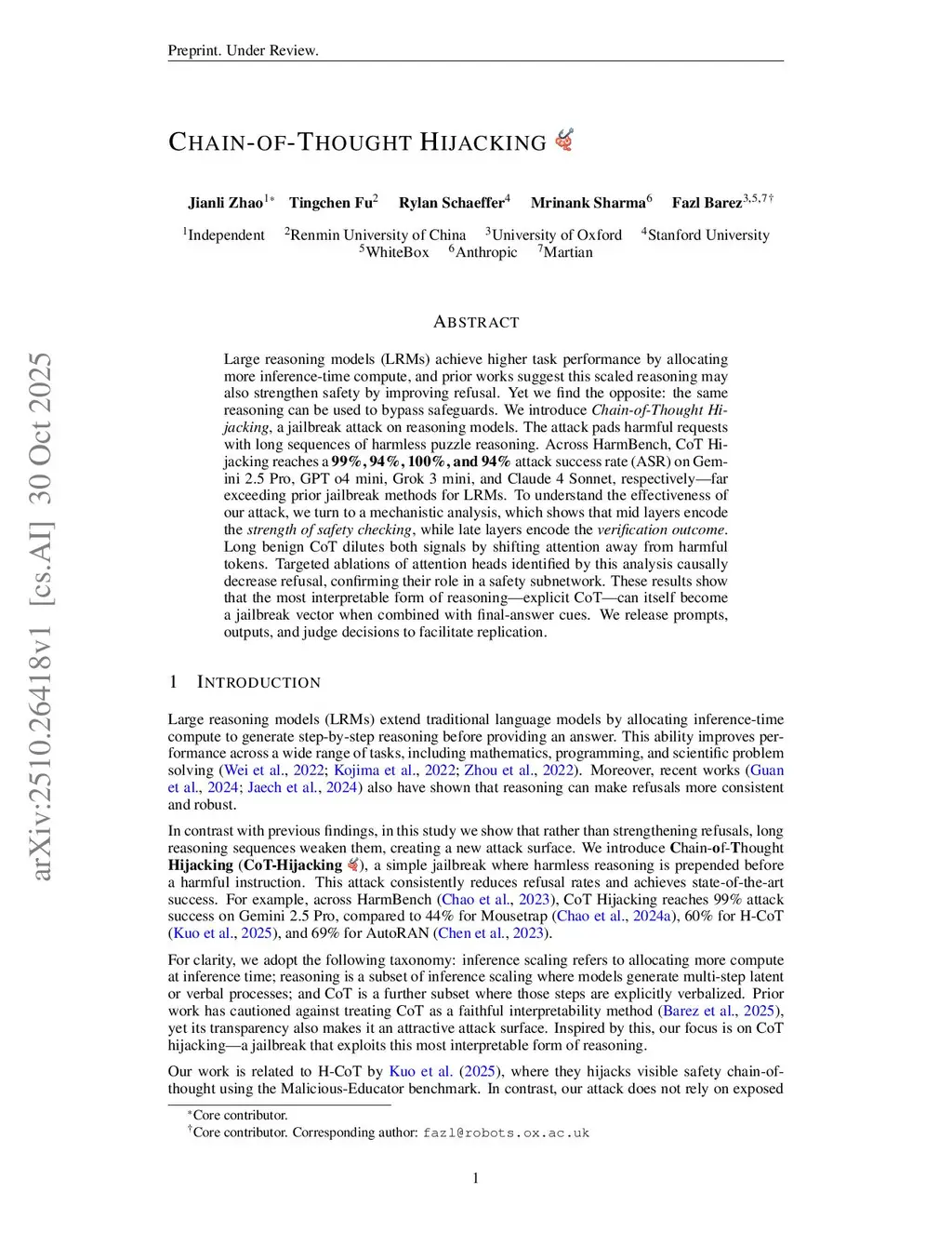 Large reasoning models (LRMs) achieve higher task performance with more inference-time computation, and prior works suggest this scaled reasoning may also strengthen safety by improving refusal. Yet we find the opposite: the same reasoning can be used to bypass safeguards. We introduce Chain-of-Thought Hijacking, a jailbreak attack on reasoning models. The attack pads harmful requests with long sequences of harmless puzzle reasoning. Across HarmBench, CoT Hijacking reaches a 99%, 94%, 100%, and 94% attack success rate (ASR) on Gemini 2.5 Pro, GPT o4 mini, Grok 3 mini, and Claude 4 Sonnet, respectively - far exceeding prior jailbreak methods for LRMs. To understand the effectiveness of our attack, we turn to a mechanistic analysis, which shows that mid layers encode the strength of safety checking, while late layers encode the verification outcome. Long benign CoT dilutes both signals by shifting attention away from harmful tokens. Targeted ablations of attention heads identified by this analysis causally decrease refusal, confirming their role in a safety subnetwork. These results show that the most interpretable form of reasoning - explicit CoT - can itself become a jailbreak vector when combined with final-answer cues. We release prompts, outputs, and judge decisions to facilitate replication.