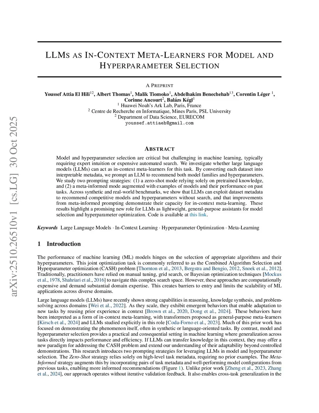 LLMs as In-Context Meta-Learners for Model and Hyperparameter Selection
