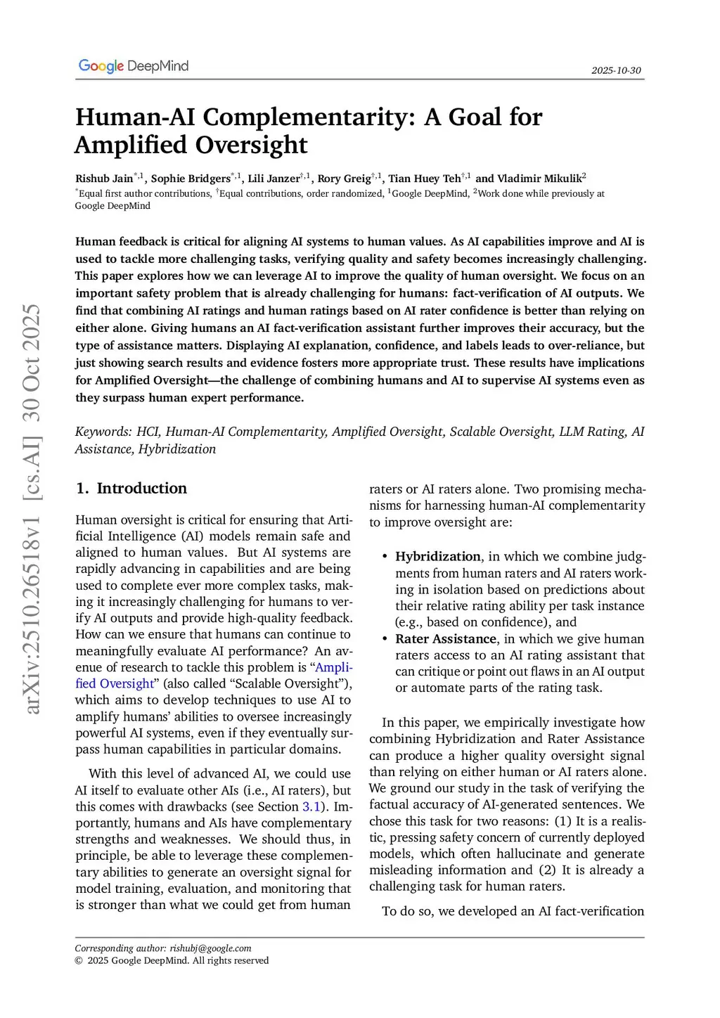 Human feedback is critical for aligning AI systems to human values. As AI capabilities improve and AI is used to tackle more challenging tasks, verifying quality and safety becomes increasingly challenging. This paper explores how we can leverage AI to improve the quality of human oversight. We focus on an important safety problem that is already challenging for humans: fact-verification of AI outputs. We find that combining AI ratings and human ratings based on AI rater confidence is better than relying on either alone. Giving humans an AI fact-verification assistant further improves their accuracy, but the type of assistance matters. Displaying AI explanation, confidence, and labels leads to over-reliance, but just showing search results and evidence fosters more appropriate trust. These results have implications for Amplified Oversight -- the challenge of combining humans and AI to supervise AI systems even as they surpass human expert performance.