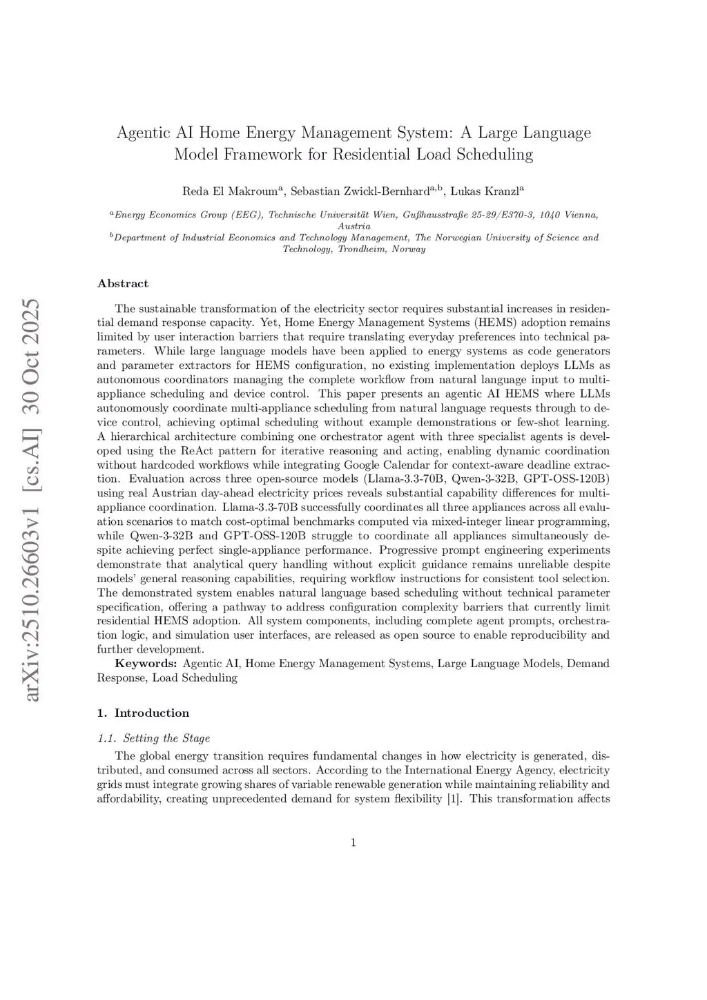 The electricity sector transition requires substantial increases in residential demand response capacity, yet Home Energy Management Systems (HEMS) adoption remains limited by user interaction barriers requiring translation of everyday preferences into technical parameters. While large language models have been applied to energy systems as code generators and parameter extractors, no existing implementation deploys LLMs as autonomous coordinators managing the complete workflow from natural language input to multi-appliance scheduling. This paper presents an agentic AI HEMS where LLMs autonomously coordinate multi-appliance scheduling from natural language requests to device control, achieving optimal scheduling without example demonstrations. A hierarchical architecture combining one orchestrator with three specialist agents uses the ReAct pattern for iterative reasoning, enabling dynamic coordination without hardcoded workflows while integrating Google Calendar for context-aware deadline extraction. Evaluation across three open-source models using real Austrian day-ahead electricity prices reveals substantial capability differences. Llama-3.3-70B successfully coordinates all appliances across all scenarios to match cost-optimal benchmarks computed via mixed-integer linear programming, while other models achieve perfect single-appliance performance but struggle to coordinate all appliances simultaneously. Progressive prompt engineering experiments demonstrate that analytical query handling without explicit guidance remains unreliable despite models' general reasoning capabilities. We open-source the complete system including orchestration logic, agent prompts, tools, and web interfaces to enable reproducibility, extension, and future research.