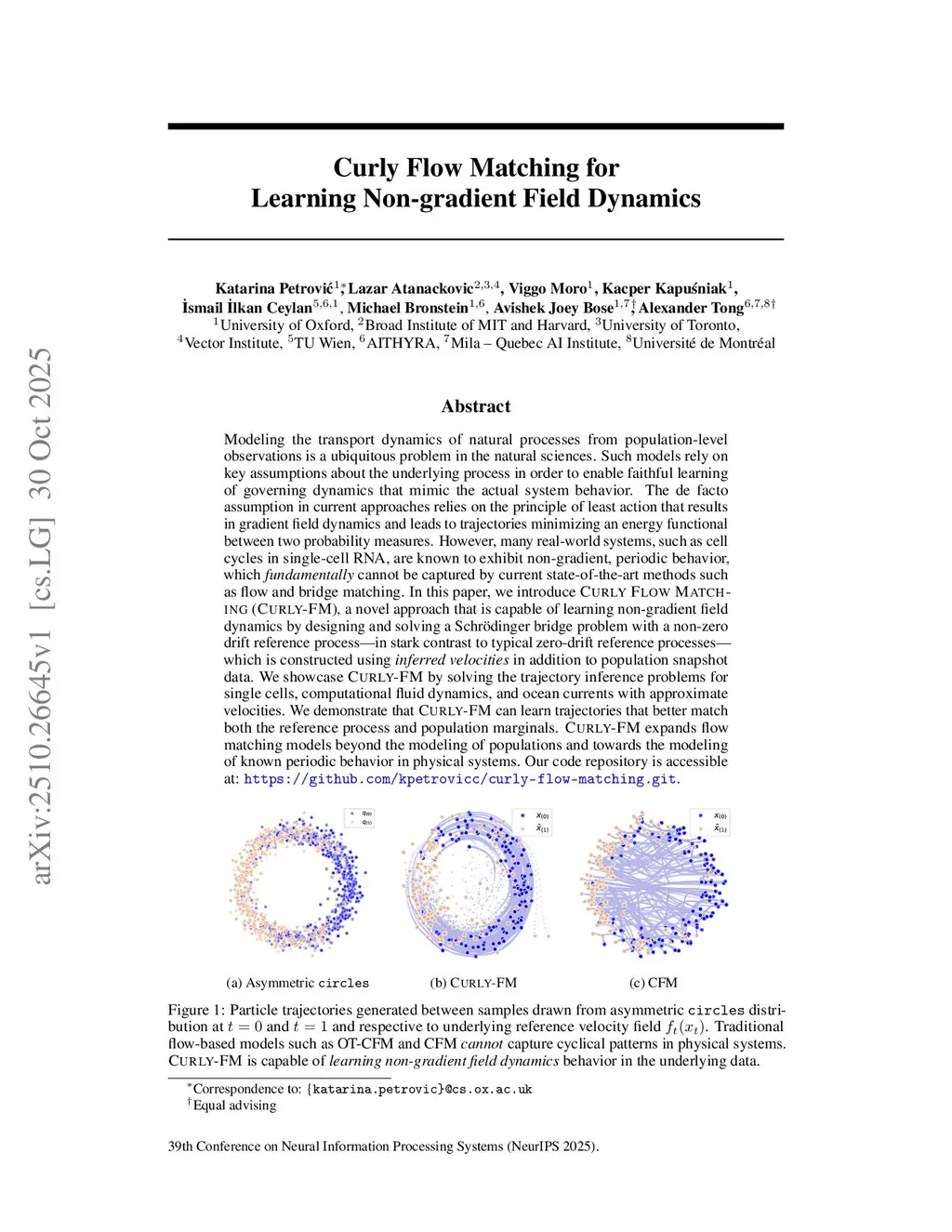 Modeling the transport dynamics of natural processes from population-level observations is a ubiquitous problem in the natural sciences. Such models rely on key assumptions about the underlying process in order to enable faithful learning of governing dynamics that mimic the actual system behavior. The de facto assumption in current approaches relies on the principle of least action that results in gradient field dynamics and leads to trajectories minimizing an energy functional between two probability measures. However, many real-world systems, such as cell cycles in single-cell RNA, are known to exhibit non-gradient, periodic behavior, which fundamentally cannot be captured by current state-of-the-art methods such as flow and bridge matching. In this paper, we introduce Curly Flow Matching (Curly-FM), a novel approach that is capable of learning non-gradient field dynamics by designing and solving a Schrödinger bridge problem with a non-zero drift reference process -- in stark contrast to typical zero-drift reference processes -- which is constructed using inferred velocities in addition to population snapshot data. We showcase Curly-FM by solving the trajectory inference problems for single cells, computational fluid dynamics, and ocean currents with approximate velocities. We demonstrate that Curly-FM can learn trajectories that better match both the reference process and population marginals. Curly-FM expands flow matching models beyond the modeling of populations and towards the modeling of known periodic behavior in physical systems. Our code repository is accessible at:this https URL