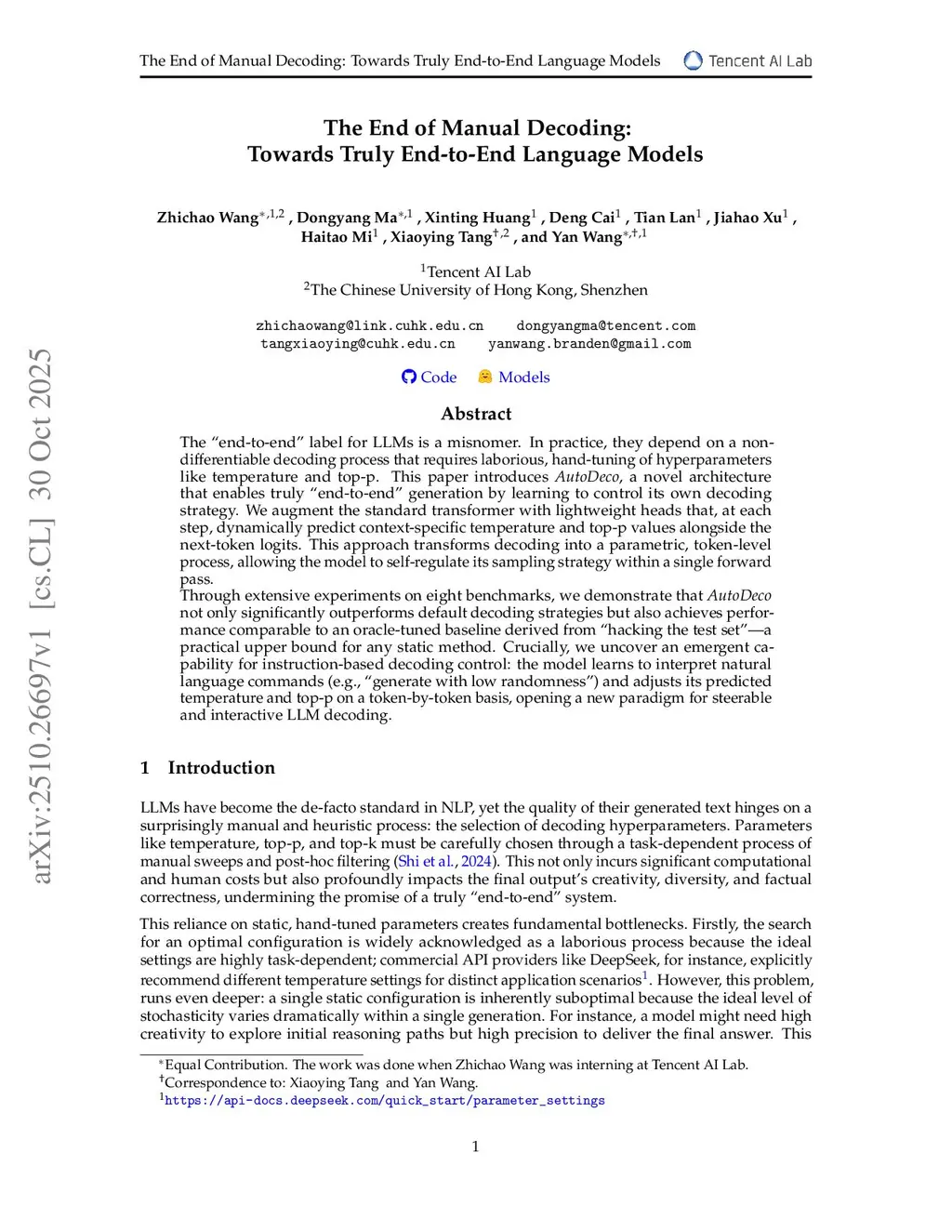 The "end-to-end" label for LLMs is a misnomer. In practice, they depend on a non-differentiable decoding process that requires laborious, hand-tuning of hyperparameters like temperature and top-p. This paper introduces AutoDeco, a novel architecture that enables truly "end-to-end" generation by learning to control its own decoding strategy. We augment the standard transformer with lightweight heads that, at each step, dynamically predict context-specific temperature and top-p values alongside the next-token logits. This approach transforms decoding into a parametric, token-level process, allowing the model to self-regulate its sampling strategy within a single forward pass.Through extensive experiments on eight benchmarks, we demonstrate that AutoDeco not only significantly outperforms default decoding strategies but also achieves performance comparable to an oracle-tuned baseline derived from "hacking the test set"-a practical upper bound for any static method. Crucially, we uncover an emergent capability for instruction-based decoding control: the model learns to interpret natural language commands (e.g., "generate with low randomness") and adjusts its predicted temperature and top-p on a token-by-token basis, opening a new paradigm for steerable and interactive LLM decoding.