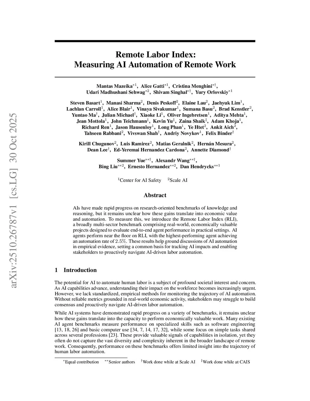 AIs have made rapid progress on research-oriented benchmarks of knowledge and reasoning, but it remains unclear how these gains translate into economic value and automation. To measure this, we introduce the Remote Labor Index (RLI), a broadly multi-sector benchmark comprising real-world, economically valuable projects designed to evaluate end-to-end agent performance in practical settings. AI agents perform near the floor on RLI, with the highest-performing agent achieving an automation rate of 2.5%. These results help ground discussions of AI automation in empirical evidence, setting a common basis for tracking AI impacts and enabling stakeholders to proactively navigate AI-driven labor automation.