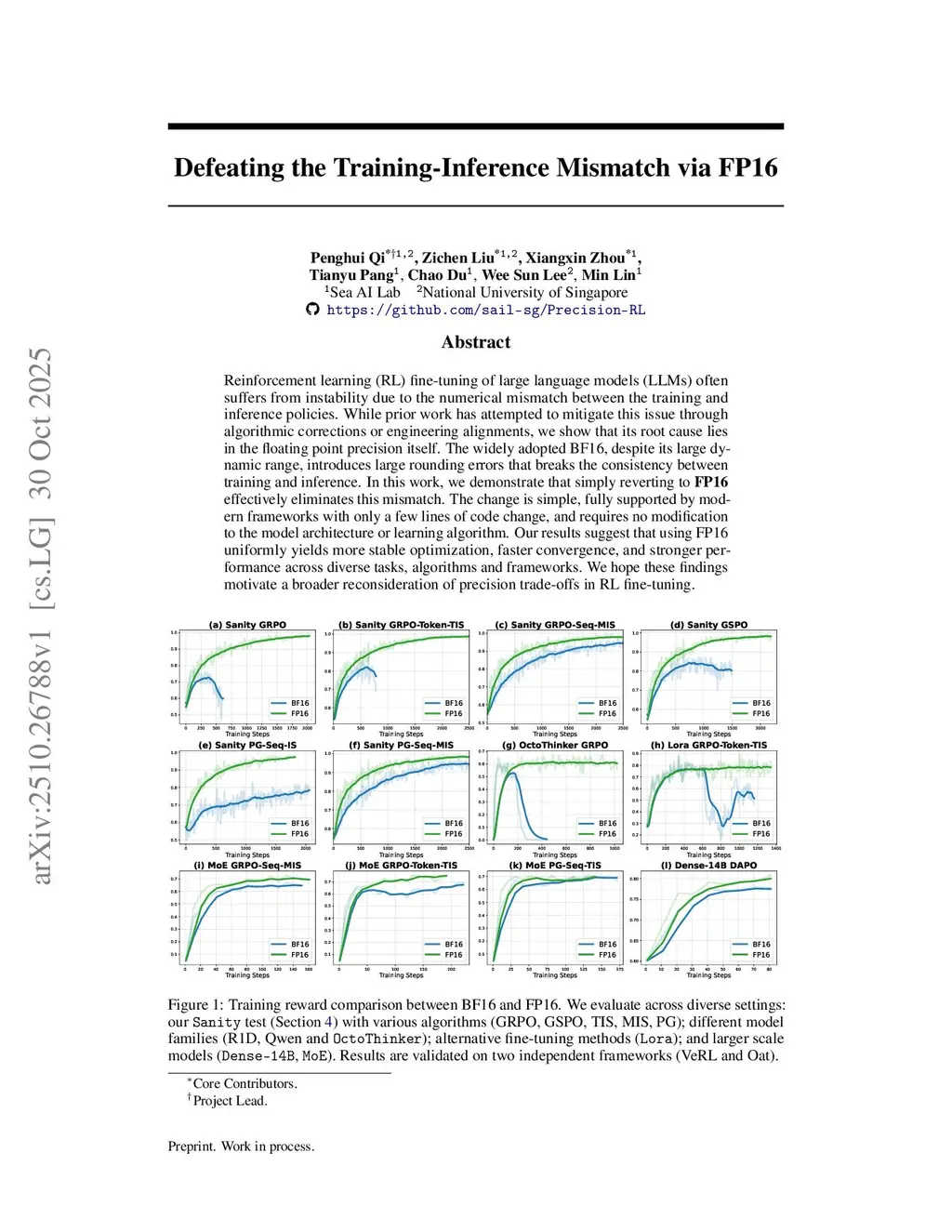 Reinforcement learning (RL) fine-tuning of large language models (LLMs) often suffers from instability due to the numerical mismatch between the training and inference policies. While prior work has attempted to mitigate this issue through algorithmic corrections or engineering alignments, we show that its root cause lies in the floating point precision itself. The widely adopted BF16, despite its large dynamic range, introduces large rounding errors that breaks the consistency between training and inference. In this work, we demonstrate that simply reverting to \textbf{FP16} effectively eliminates this mismatch. The change is simple, fully supported by modern frameworks with only a few lines of code change, and requires no modification to the model architecture or learning algorithm. Our results suggest that using FP16 uniformly yields more stable optimization, faster convergence, and stronger performance across diverse tasks, algorithms and frameworks. We hope these findings motivate a broader reconsideration of precision trade-offs in RL fine-tuning.