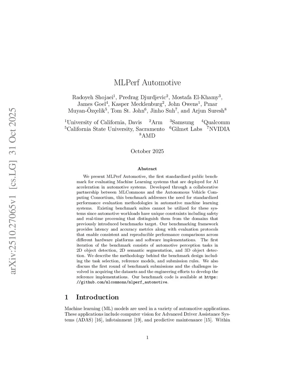 We present MLPerf Automotive, the first standardized public benchmark for evaluating Machine Learning systems that are deployed for AI acceleration in automotive systems. Developed through a collaborative partnership between MLCommons and the Autonomous Vehicle Computing Consortium, this benchmark addresses the need for standardized performance evaluation methodologies in automotive machine learning systems. Existing benchmark suites cannot be utilized for these systems since automotive workloads have unique constraints including safety and real-time processing that distinguish them from the domains that previously introduced benchmarks target. Our benchmarking framework provides latency and accuracy metrics along with evaluation protocols that enable consistent and reproducible performance comparisons across different hardware platforms and software implementations. The first iteration of the benchmark consists of automotive perception tasks in 2D object detection, 2D semantic segmentation, and 3D object detection. We describe the methodology behind the benchmark design including the task selection, reference models, and submission rules. We also discuss the first round of benchmark submissions and the challenges involved in acquiring the datasets and the engineering efforts to develop the reference implementations. Our benchmark code is available atthis https URL.
