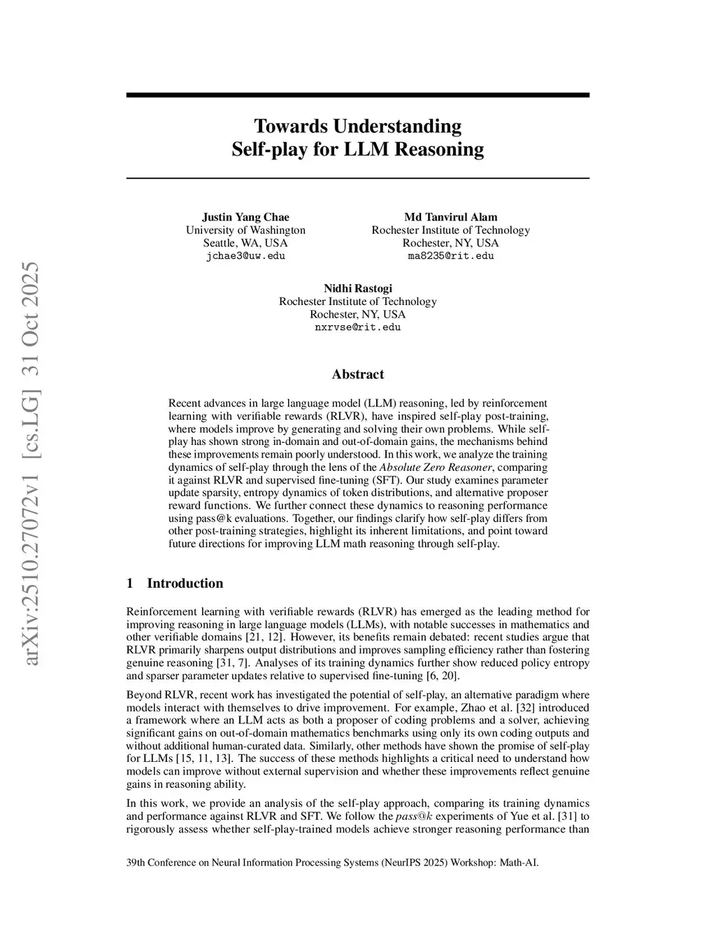 Recent advances in large language model (LLM) reasoning, led by reinforcement learning with verifiable rewards (RLVR), have inspired self-play post-training, where models improve by generating and solving their own problems. While self-play has shown strong in-domain and out-of-domain gains, the mechanisms behind these improvements remain poorly understood. In this work, we analyze the training dynamics of self-play through the lens of the Absolute Zero Reasoner, comparing it against RLVR and supervised fine-tuning (SFT). Our study examines parameter update sparsity, entropy dynamics of token distributions, and alternative proposer reward functions. We further connect these dynamics to reasoning performance using pass@k evaluations. Together, our findings clarify how self-play differs from other post-training strategies, highlight its inherent limitations, and point toward future directions for improving LLM math reasoning through self-play.