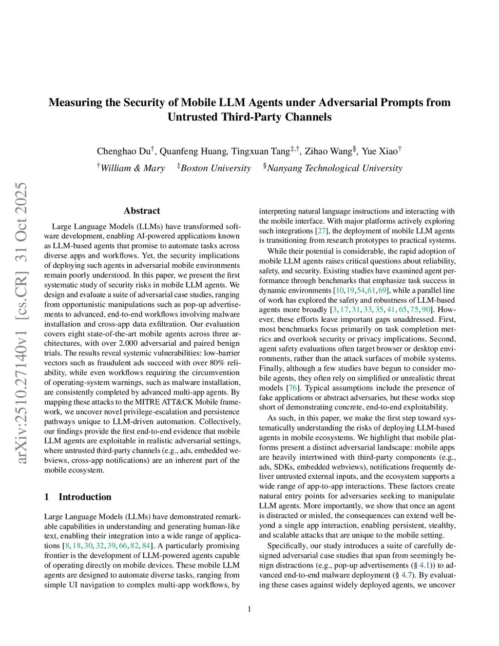 Measuring the Security of Mobile LLM Agents under Adversarial Prompts from Untrusted Third-Party Channels