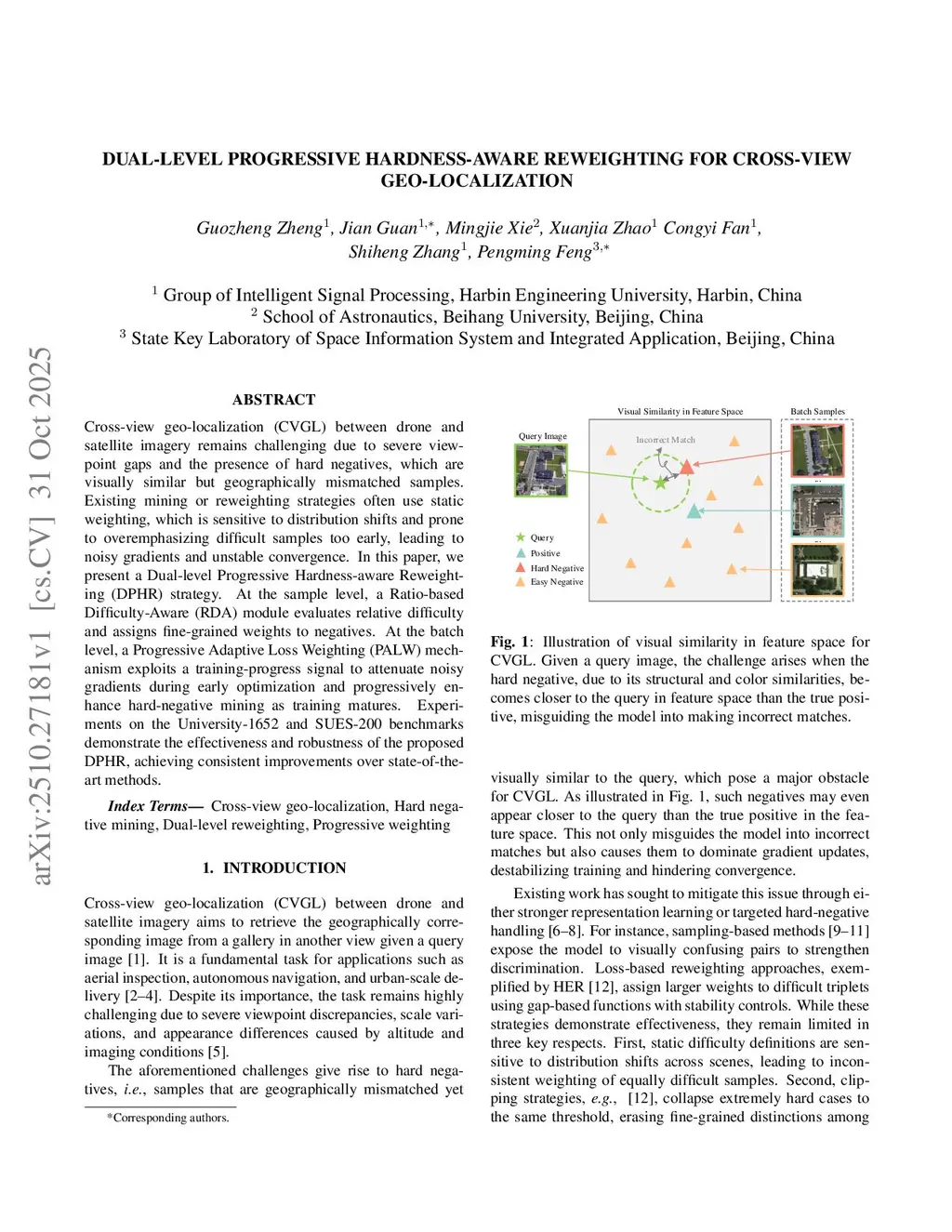 Cross-view geo-localization (CVGL) between drone and satellite imagery remains challenging due to severe viewpoint gaps and the presence of hard negatives, which are visually similar but geographically mismatched samples. Existing mining or reweighting strategies often use static weighting, which is sensitive to distribution shifts and prone to overemphasizing difficult samples too early, leading to noisy gradients and unstable convergence. In this paper, we present a Dual-level Progressive Hardness-aware Reweighting (DPHR) strategy. At the sample level, a Ratio-based Difficulty-Aware (RDA) module evaluates relative difficulty and assigns fine-grained weights to negatives. At the batch level, a Progressive Adaptive Loss Weighting (PALW) mechanism exploits a training-progress signal to attenuate noisy gradients during early optimization and progressively enhance hard-negative mining as training matures. Experiments on the University-1652 and SUES-200 benchmarks demonstrate the effectiveness and robustness of the proposed DPHR, achieving consistent improvements over state-of-the-art methods.