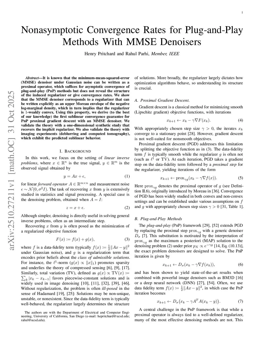 It is known that the minimum-mean-squared-error (MMSE) denoiser under Gaussian noise can be written as a proximal operator, which suffices for asymptotic convergence of plug-and-play (PnP) methods but does not reveal the structure of the induced regularizer or give convergence rates. We show that the MMSE denoiser corresponds to a regularizer that can be written explicitly as an upper Moreau envelope of the negative log-marginal density, which in turn implies that the regularizer is 1-weakly convex. Using this property, we derive (to the best of our knowledge) the first sublinear convergence guarantee for PnP proximal gradient descent with an MMSE denoiser. We validate the theory with a one-dimensional synthetic study that recovers the implicit regularizer. We also validate the theory with imaging experiments (deblurring and computed tomography), which exhibit the predicted sublinear behavior.