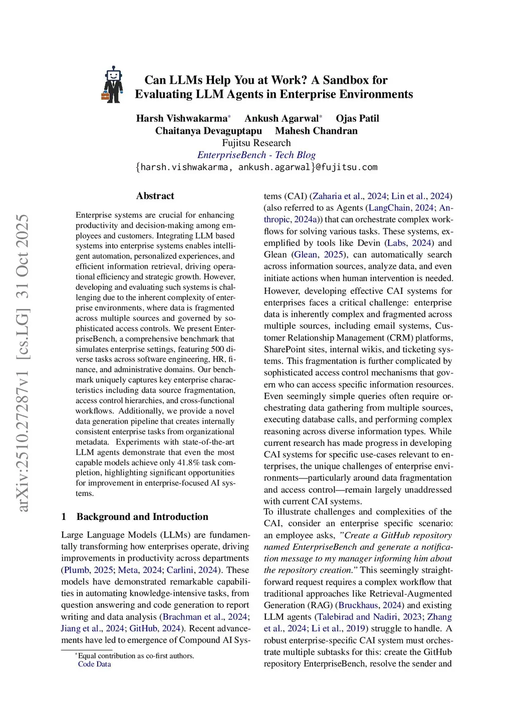 Enterprise systems are crucial for enhancing productivity and decision-making among employees and customers. Integrating LLM based systems into enterprise systems enables intelligent automation, personalized experiences, and efficient information retrieval, driving operational efficiency and strategic growth. However, developing and evaluating such systems is challenging due to the inherent complexity of enterprise environments, where data is fragmented across multiple sources and governed by sophisticated access controls. We present EnterpriseBench, a comprehensive benchmark that simulates enterprise settings, featuring 500 diverse tasks across software engineering, HR, finance, and administrative domains. Our benchmark uniquely captures key enterprise characteristics including data source fragmentation, access control hierarchies, and cross-functional workflows. Additionally, we provide a novel data generation pipeline that creates internally consistent enterprise tasks from organizational metadata. Experiments with state-of-the-art LLM agents demonstrate that even the most capable models achieve only 41.8% task completion, highlighting significant opportunities for improvement in enterprise-focused AI systems.