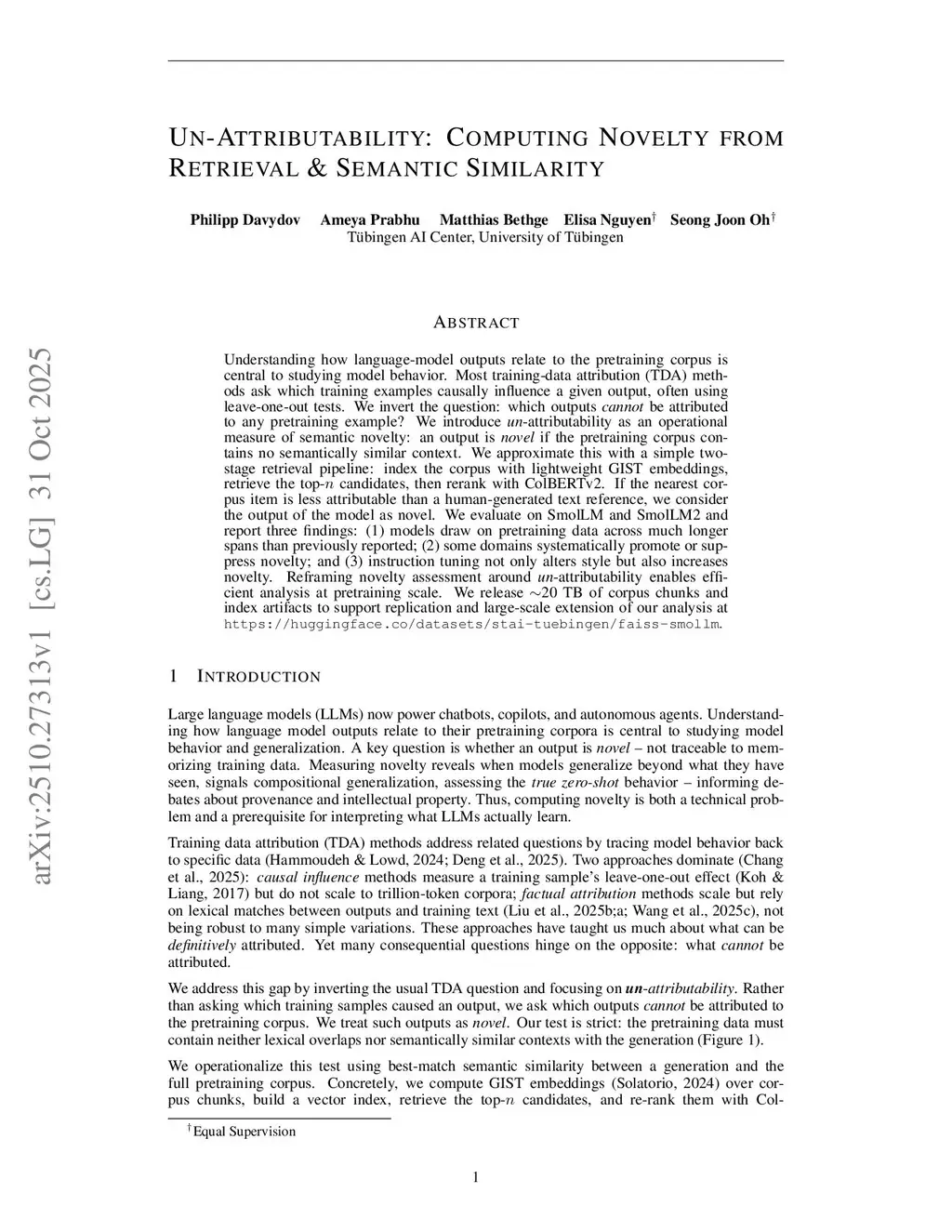 Generation novelty is a key indicator of an LLM's ability to generalize, yet measuring it against full pretraining corpora is computationally challenging. Existing evaluations often rely on lexical overlap, failing to detect paraphrased text, or do not consider the full pretraining corpus. We frame novelty as a semantic retrieval problem. This framing enables us to address novelty with modern embedding and indexing pipelines, allowing for efficient analysis at pre-training scale. Specifically, we propose a three-stage framework that retrieves semantically similar samples, reranks them at varying subsequence lengths, and calibrates scores using a human novelty reference for interpretability. We apply this framework to the SmolLM model family and report three key findings: (1) models draw on pre-training data across much longer sequences than previously reported; (2) some task domains systematically promote or suppress generation novelty; and (3) instruction tuning not only alters style but also increases novelty. These results highlight the value of semantic novelty analysis for studying generalization. To support reproducibility and further research, we release ~20 TB of corpus chunks and index artifacts atthis https URL
